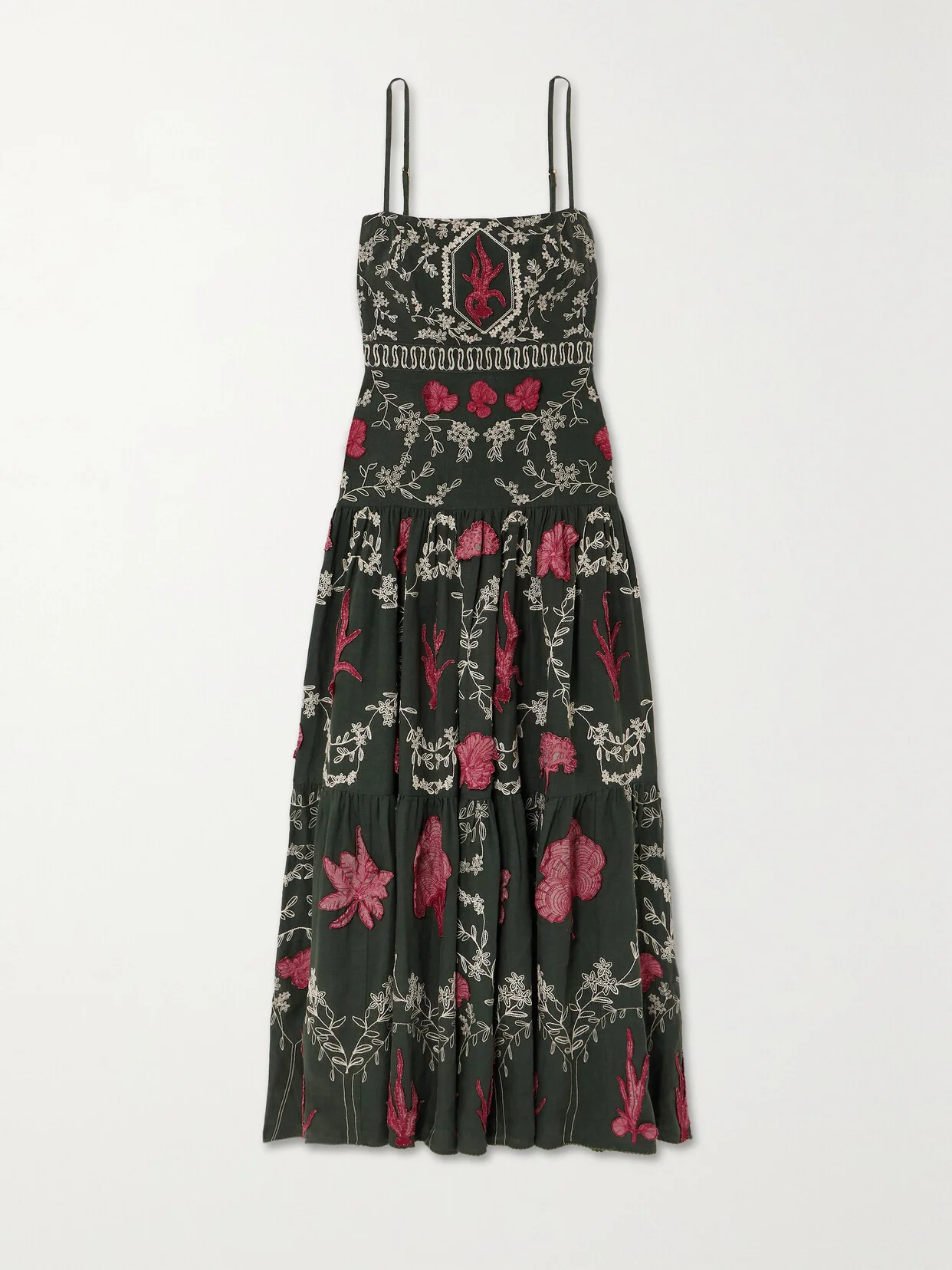 + Net Sustain Lima Encaje Tiered Appliquéd Embroidered Linen Maxi Dress
