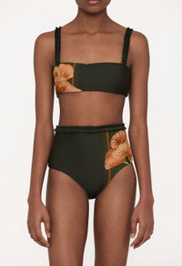 Our 'Olmo Palma' bikini top features gorgeous hand-embroidered details, a sleek square neckline, and sweet ruffled trim. Pair it with our 'Nopal Palma' bikini bottom for an impeccable ensemble. This garment is made using recycled polyester. Our swimwear garments offer up to UPF 50 sun protection. COMPOSITION 78% Polyamide 22% Elastane SIZE & FIT Yinny is 5´8 / 179 cm and is wearing a size Extra Small