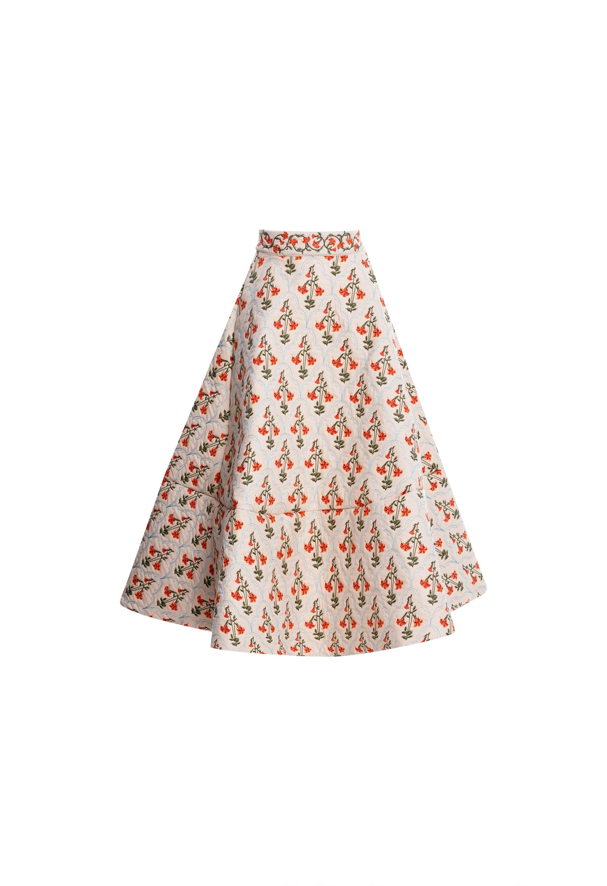 Our 'Bergamota Sabanero Atardecer' is a one-of-a-kind quilted maxi skirt featuring extensive embroidery and a unique laser-cut floral detail at the hem. Pair it with our stunning 'Moringa Sabanero Atardecer' crop top for a glorious ensemble. This garment features concealed zip fastening along the back. COMPOSITION 97% Cotton 3% Elastane SIZE & FIT Jessica wears a size Extra Small. This style runs big