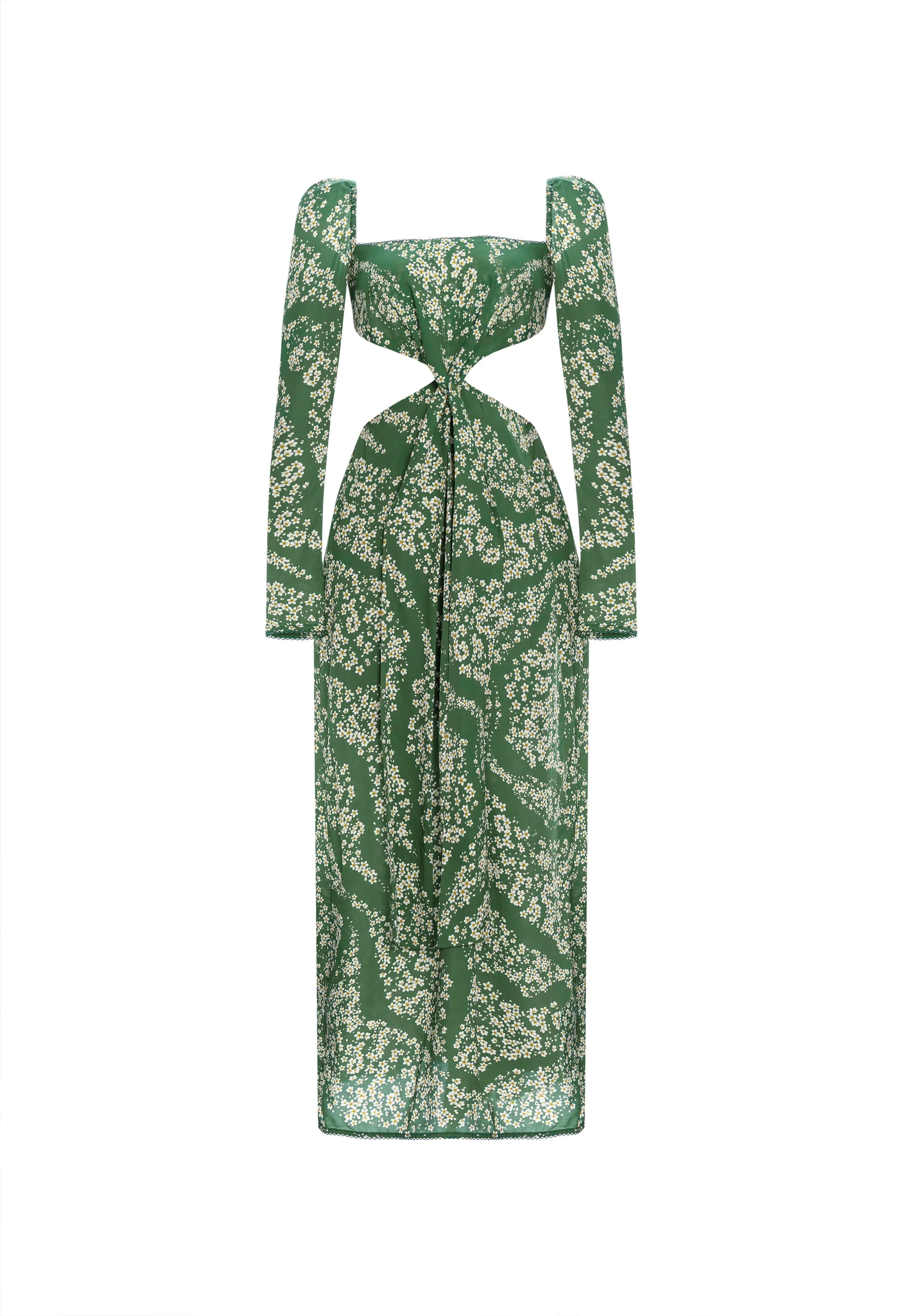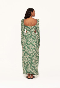 Elevate any special occasion with our new 'Cuarzo Astro Esmeralda' maxi dress, the perfect combination of elegance and fun. This garment features fitted long sleeves, a striking square neckline, chic cutouts at the waist, and concealed zip fastening along the back. COMPOSITION 100% Viscose SIZE & FIT Luisa wears a size Small. This style fits true to size