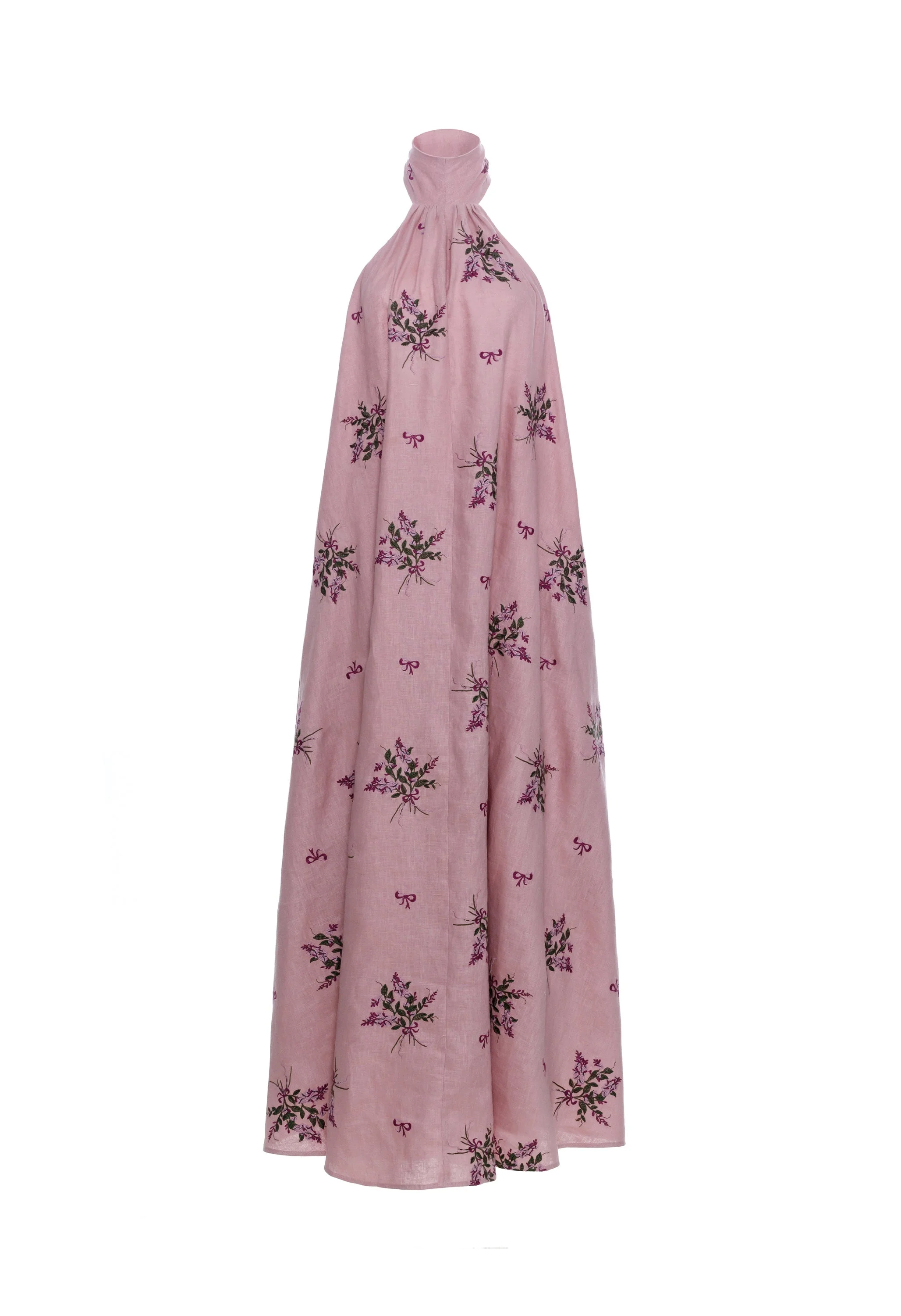 Our new ´Efimero Wisteria´ maxi dress is the epitome of sophistication with it’s fully embroidered fabric and a high neckline accompanied by a bow detail that drapes elegantly over the shoulder. With a floral print on pink hues, this piece is perfect formal occasions or garden soirees. - Fully embroidered - New silhouette - Maxi length - Lining included - mono COMPOSITION 100% Linen SIZE & FIT Isabella is 179 cm / 5´9 and is wearing a size extra small