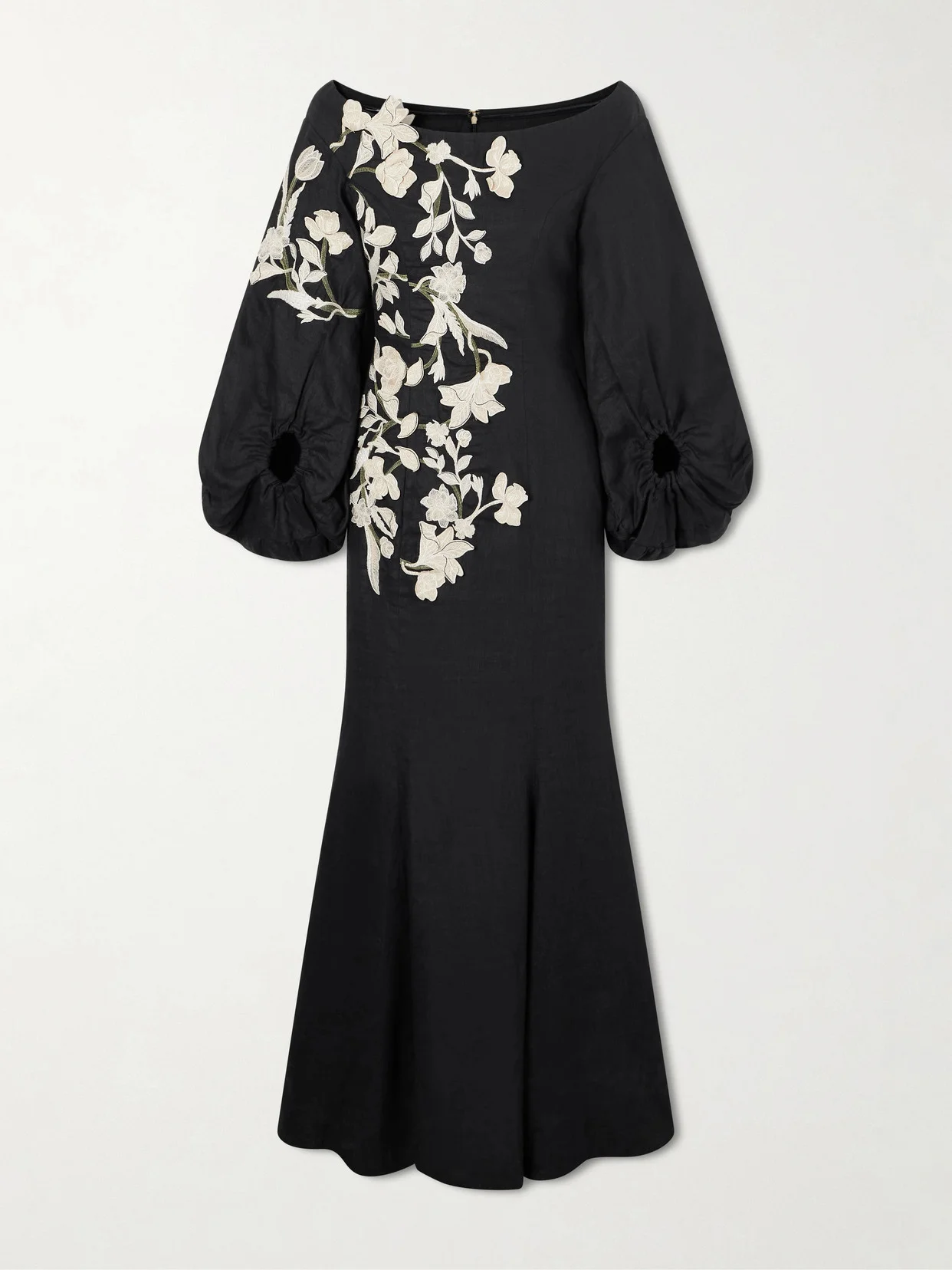 EXCLUSIVE AT NET-A-PORTER. Agua by Agua Bendita's 'Pecana' dress is inspired by Colombia's biodiversity and has been locally made from breathable linen. It has a shoulder-sweeping neckline, voluminous blouson sleeves and a flared maxi hemline. The beautiful floral embroidery winds up the left side.