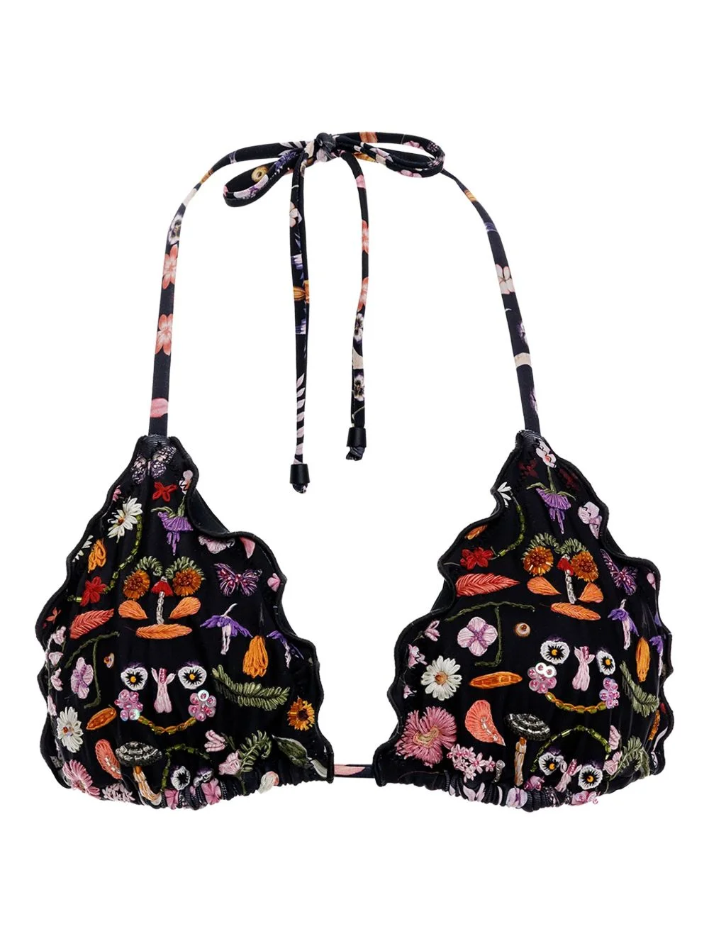 embroidered ruffled bikini top Highlights - Multicolour - Floral embroidery - Sequined embellishments - Ruffled trim - Triangle top - Tie sides - Be mindful to try on swimwear over your own garments. Imported Composition Elastane 50%, Recycled Polyester 50% Washing instructions Read Manufacturer Guidelines