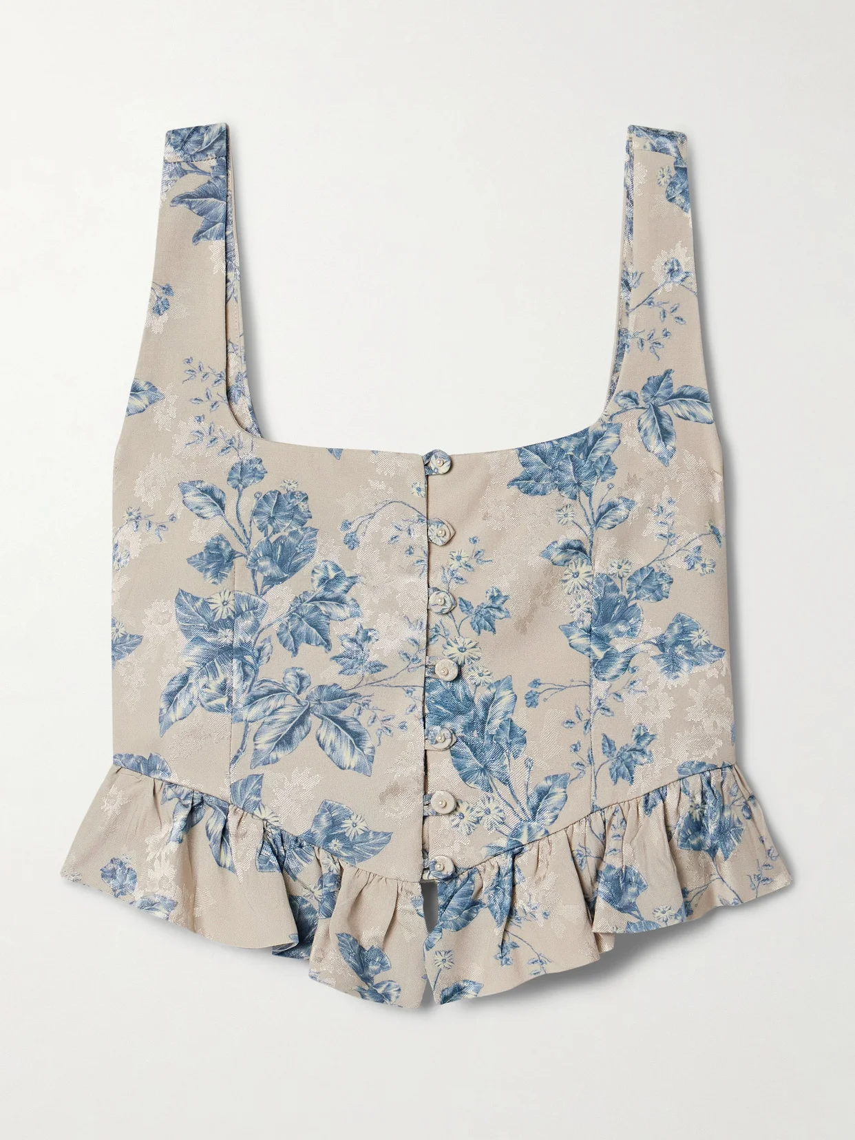 Agua by Agua Bendita's 'Eslabon Bougainvillea' top is printed and jacquard-woven with contrasting vintage-inspired floral patterns. Made from satin, it has a slim bodice and cropped ruffled hem. Match your jewelry to the faux pearl buttons.
