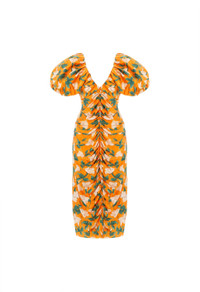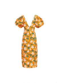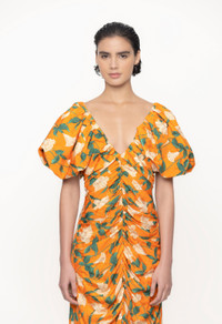 The epitome of contemporary fashion, our 'Camelia Sabanero Dorado' is a midi viscose jacquard dress that works beautifully for midday gatherings and tropical soirees alike. This garment features a deep-v neckline, lovely balloon sleeves, and concealed zip fastening along the back. COMPOSITION 45% Viscose 55% Viscose ecovero SIZE & FIT Jessica wears a size Extra Small. This style runs big