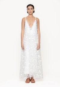 A showstopping dress for a coastal bride, the 'Hierbaluisa Diente de Leon Amanecer' slip-on maxi dress in flawless white features a deep-v neckline and exquisite transparent embroidered fabric. COMPOSITION 100% Polyester SIZE & FIT Jessica wears a size Extra Small. This style runs big