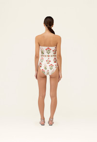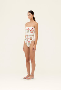 Our ´Ilusion Canna´ is an elegant strapless bathing suit that features handmade embroidery in the waistband. Perfect for poolside lounging and sand-filled days alike, this piece is as sophisticated as it is versatile. Pair it with our ´Lavanda Wild´ for an impeccable beach ensemble. - Hand Embroidered - Strapless - Lining included - Made from recycled polyester - UPF 50+ sun protection COMPOSITION 81% Recycled Polyester, 19% Elastane SIZE & FIT Jessica is 177 cm / 5´8 and is wearing a size extra small.