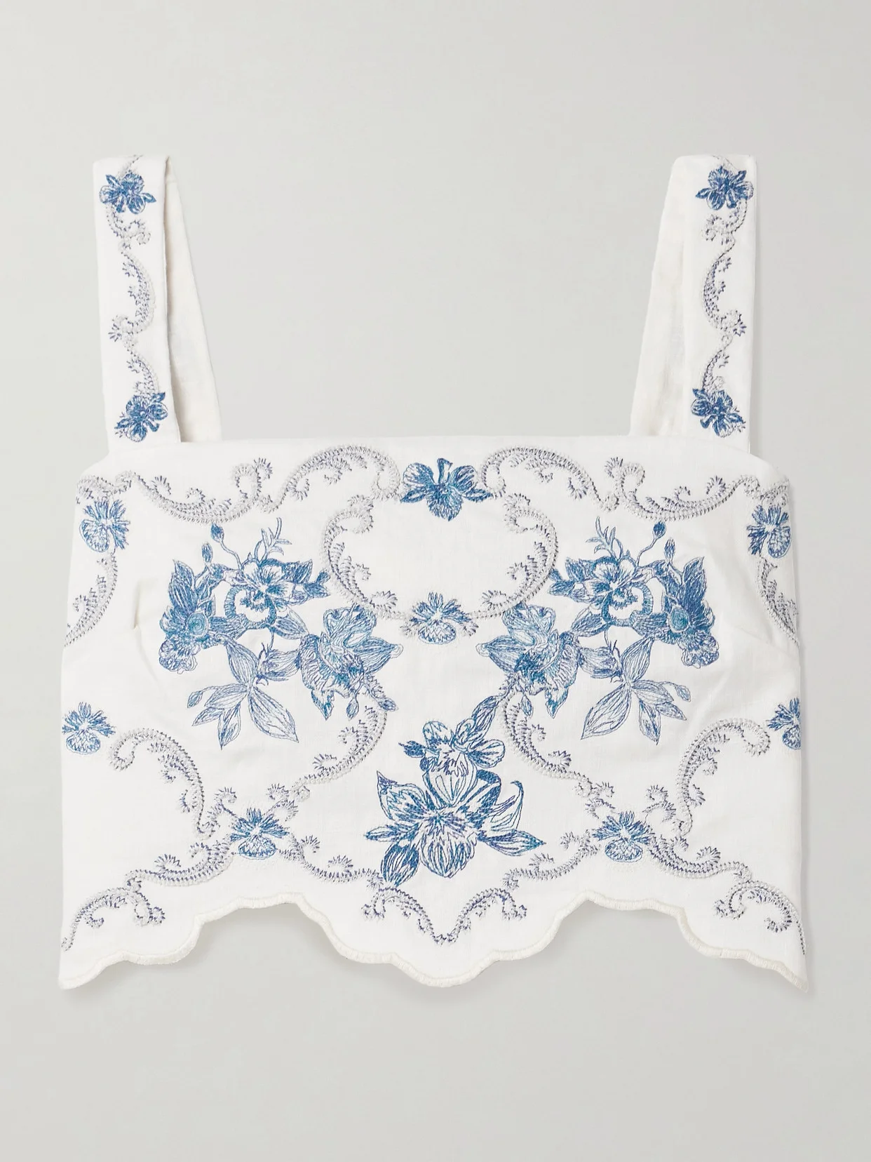Luciana Gloriosa Cropped Scalloped Embroidered Linen Tank