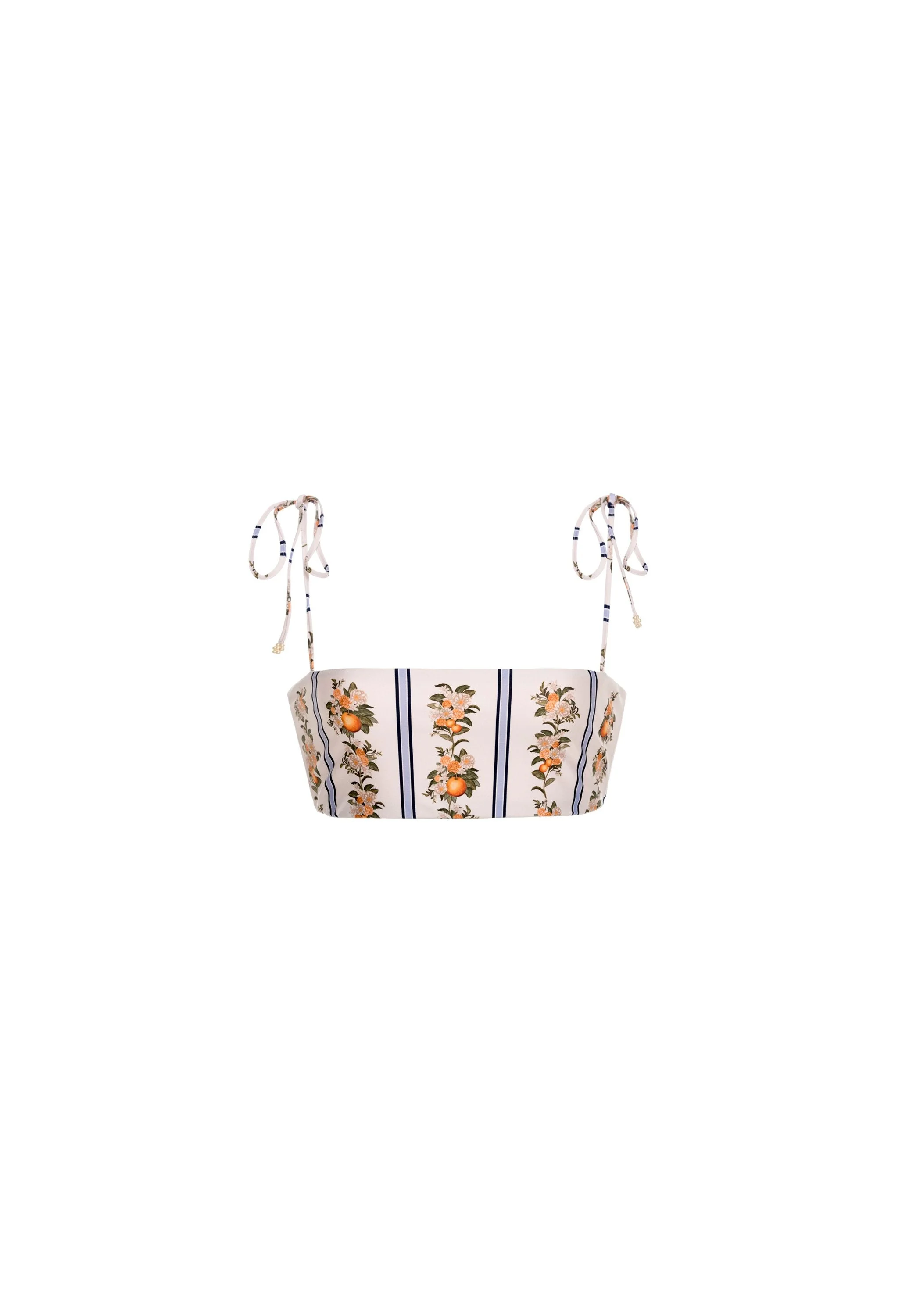 Our Primavera Valle is a lovely bandeau bikini top with finishing pearl details on the straps. This piece pairs wonderfully with our Magenta Valle bikini bottom and our Datil Valle Kaftan. This piece is made using recycled polyester. Our swimwear garments offer up to UPF 50 sun protection. -Bandeau style -Adjustable straps -Lining included -Made using recycled polyester -UPF 50 sun protection -Placement Print -Hand embroidered details on the straps COMPOSITION 81% Recycled Polyester 19% Elastane Lining: 78% Polyamide, 22% Elastane SIZE & FIT Anastasia is 177 cm / 510 and is wearing a size extra small