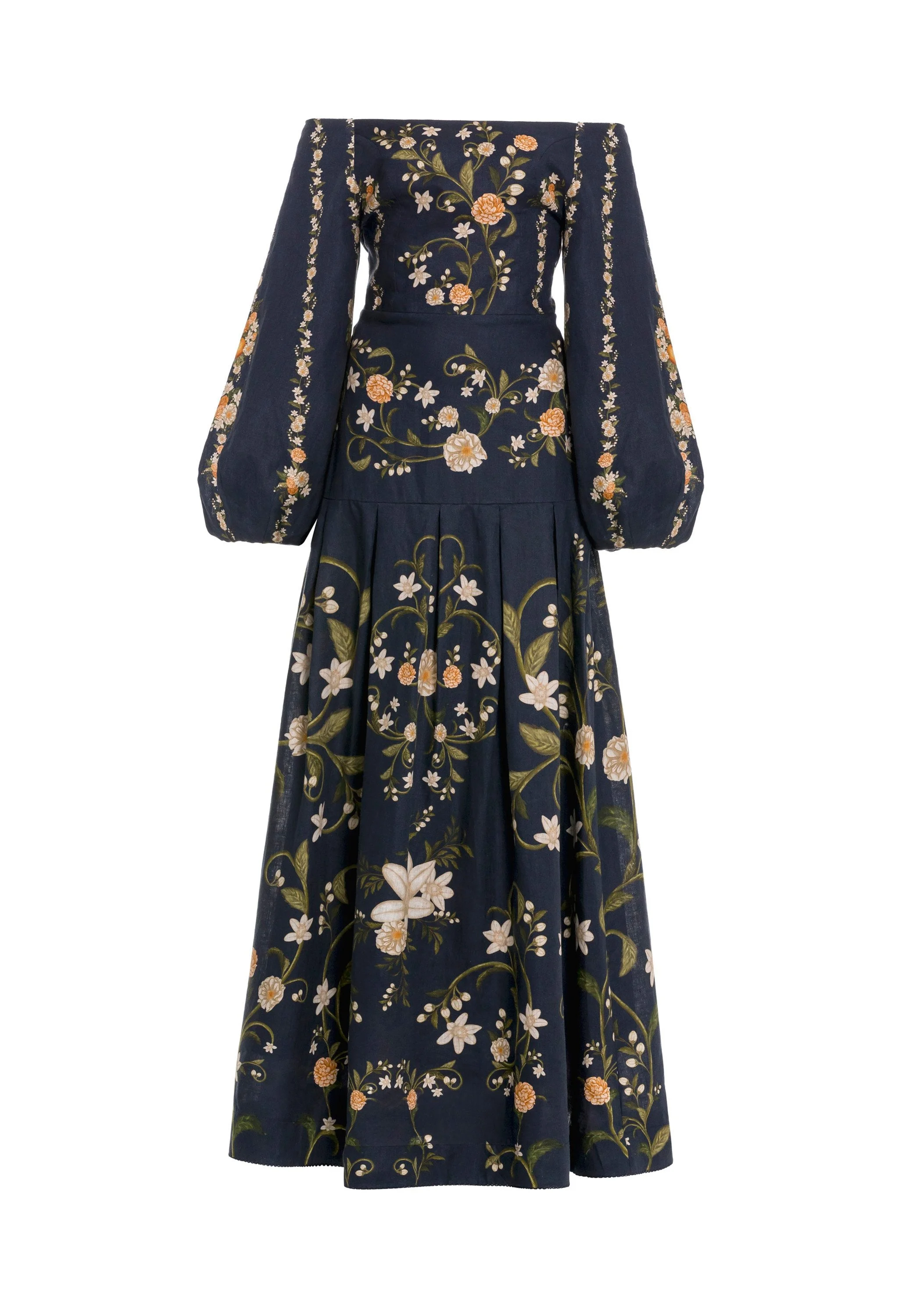 A dress made for long days that turn into evenings. Crafted in breathable linen, the Senlis Valle maxi dress designed with an off-shoulder silhouette and finished with an internal silicone grip to ensure a secure, comfortable fit. Its voluminous puff sleeves and a drop waist create a fluid drape that moves with ease. A concealed back zip ensures a clean, refined finish. -Best seller -Placement Print -Crochet finishing details along the hem -Off shoulders -Maxi length -Concealed zip fastening along the back -Adjustable tie fastening along the back COMPOSITION 100% Linen Lining: 100% Cotton SIZE & FIT Anastasia is 177 cm / 510 and is wearing a size extra small