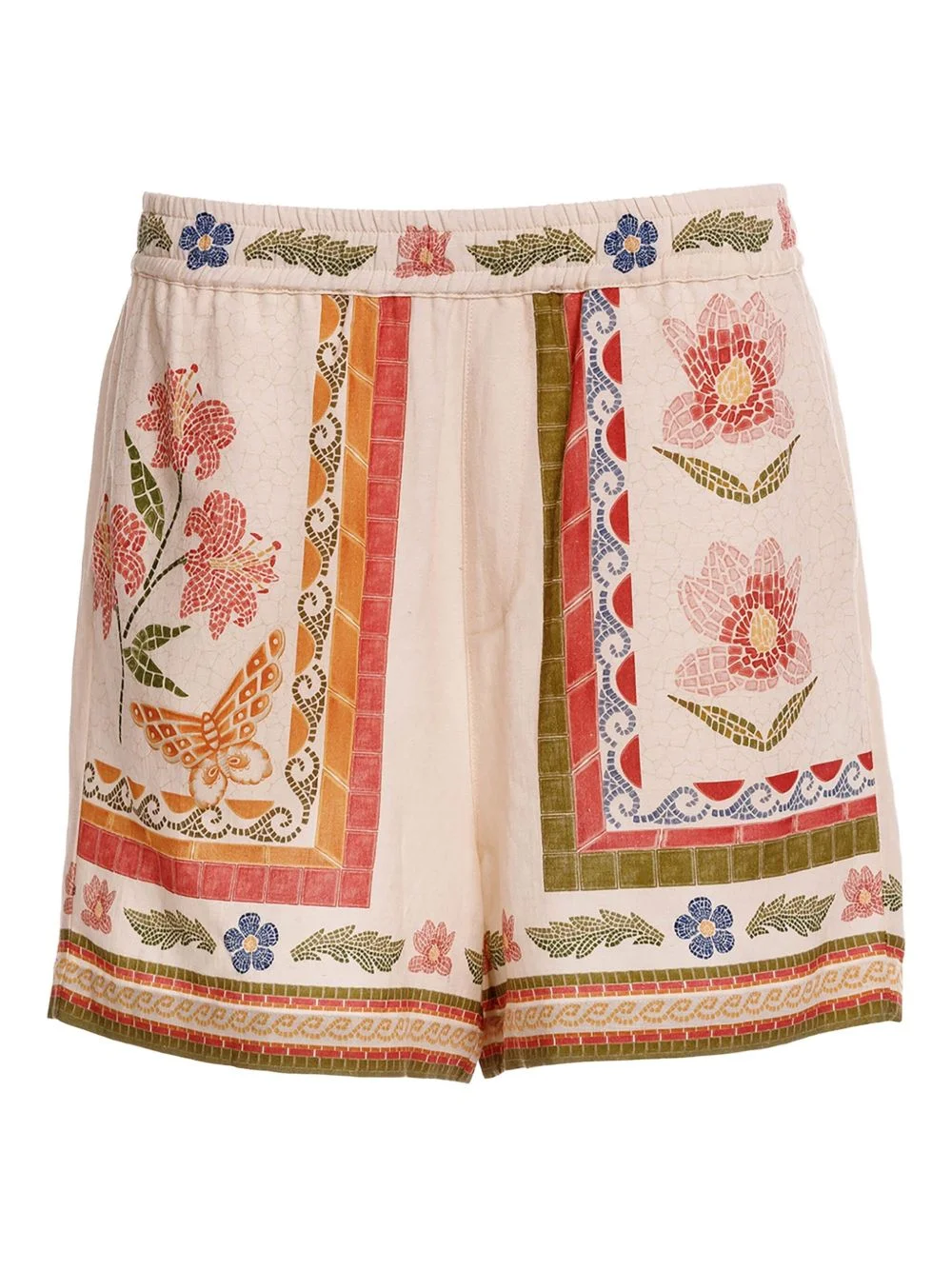 Watts floral mosaic shorts Highlights - Off-white - Floral mosaic pattern - Butterfly motif - Elasticated waistband - Side pockets - Decorative border Imported Composition Viscose 46%, Cotton 31%, Linen/Flax 23% Washing instructions Read Manufacturer Guidelines