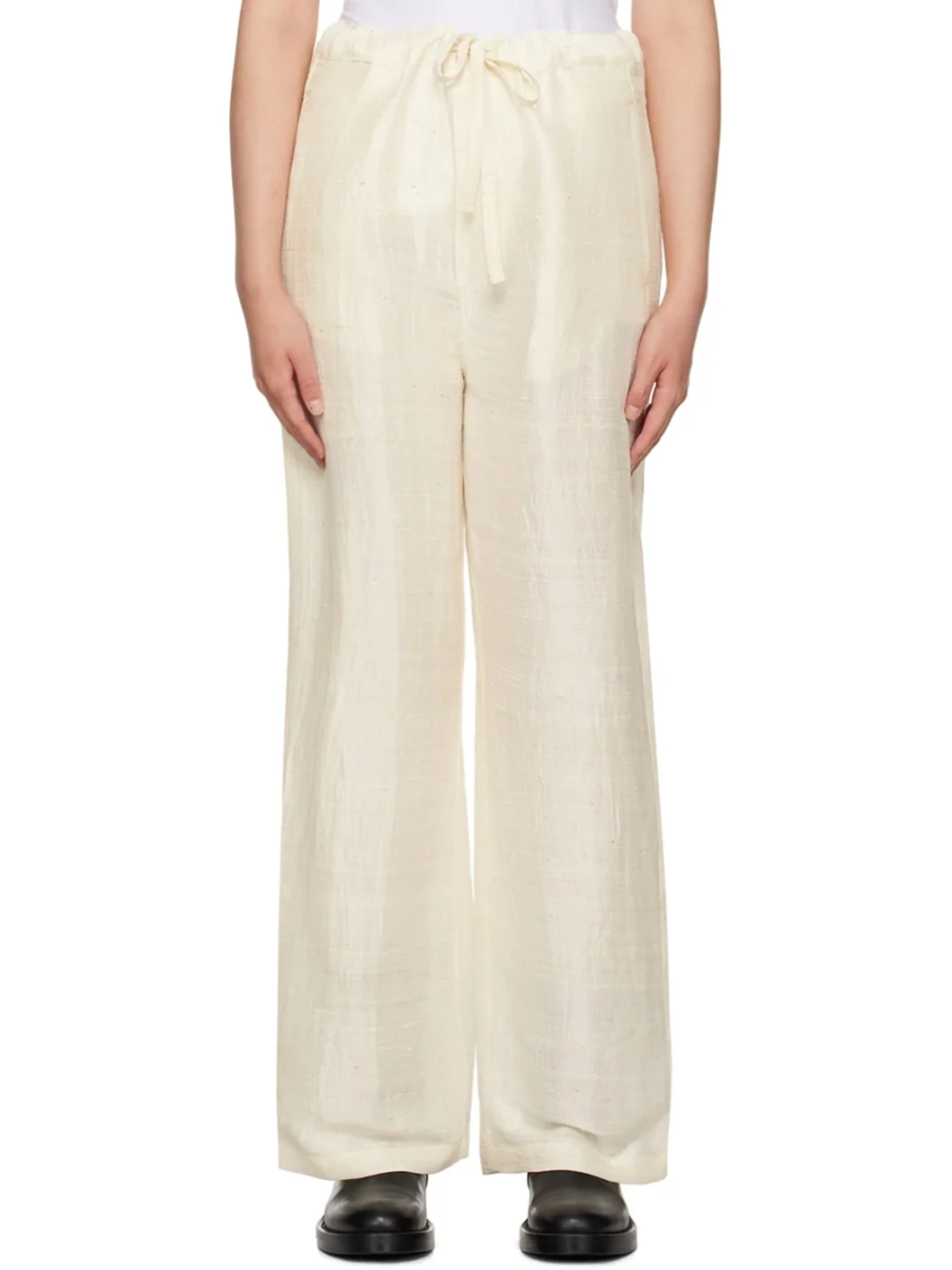Silk khadi trousers. · Self-tie drawstring at waistband · Four-pocket styling · Button-fly · Logo embroidered at back · Unlined Supplier color: Natural 100% silk. Made in United States 231460F087002