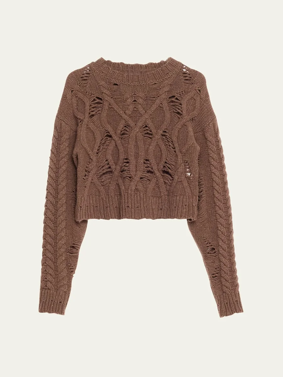 Aisling Camps cable-knit sweater with distressed detail Crew neckline Long sleeves Relaxed fit Cropped length Slip-on closure Merino wool/cashmere Unlined Made in Italy Model is 5'10"/177cm. Online Inquiries: BGS21_B9F32| Store Inquiries: #4858740
