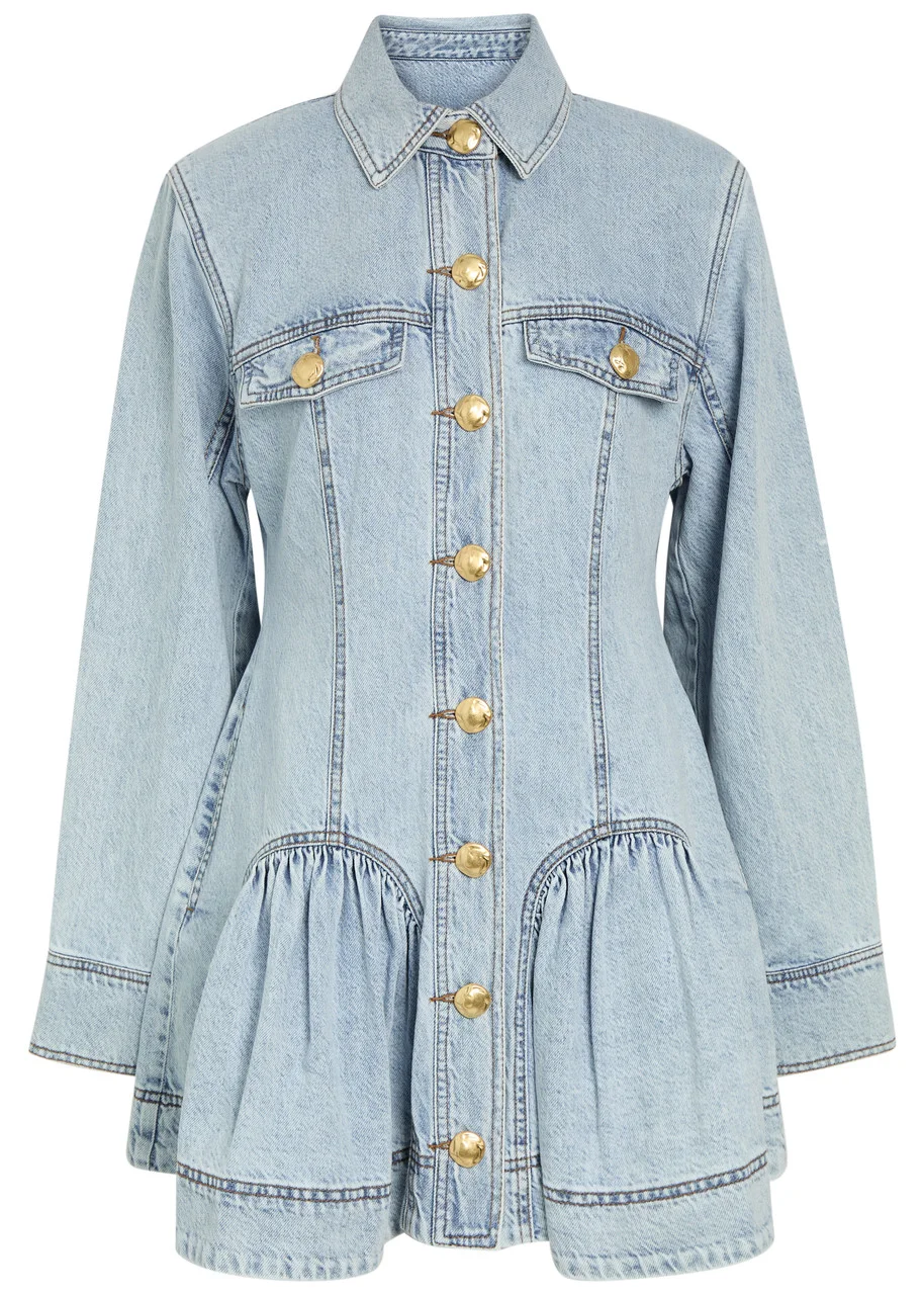 Info & Care Aje denim dress Padded shoulders, press-stud fastening cuffs, button-fastening chest flap pocket, side slip pockets, gathered godet detail at skirt Button fastening through front; 100% cotton; Machine wash cold inside out to avoid colour transfer Size & Fit Length shoulder to hem: 32 inches/ 81.5cm Midweight Fit-and-flare style Model is 5'10"/ 178cm and wears a size UK8