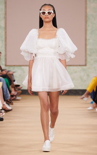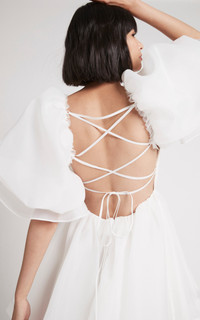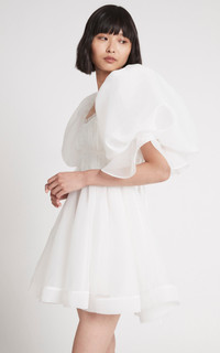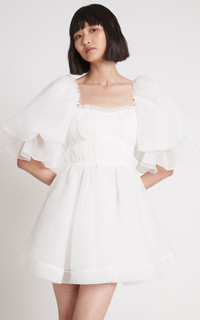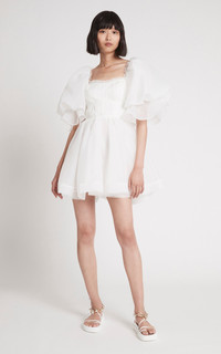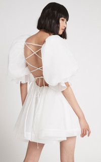 Astrid Tie Back Mini Dress PRODUCT DETAILS - As seen on the Resort '23 runway, wear yours with sneakers to mirror the brand styling - Slim fit, square neck, balloon sleeves, ruffled trim, mini hem, unlined - Tie fastening along back - This style fits true to size, we suggest taking your normal size - Composition: 100% Polyester - Dry Clean Only - Imported SIZE & FIT - Model wears a sample size AU 6 - This style runs true to size - We suggest taking your usual size