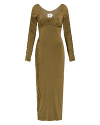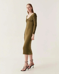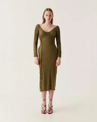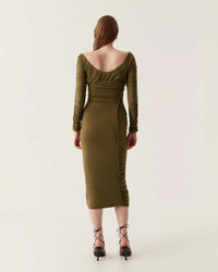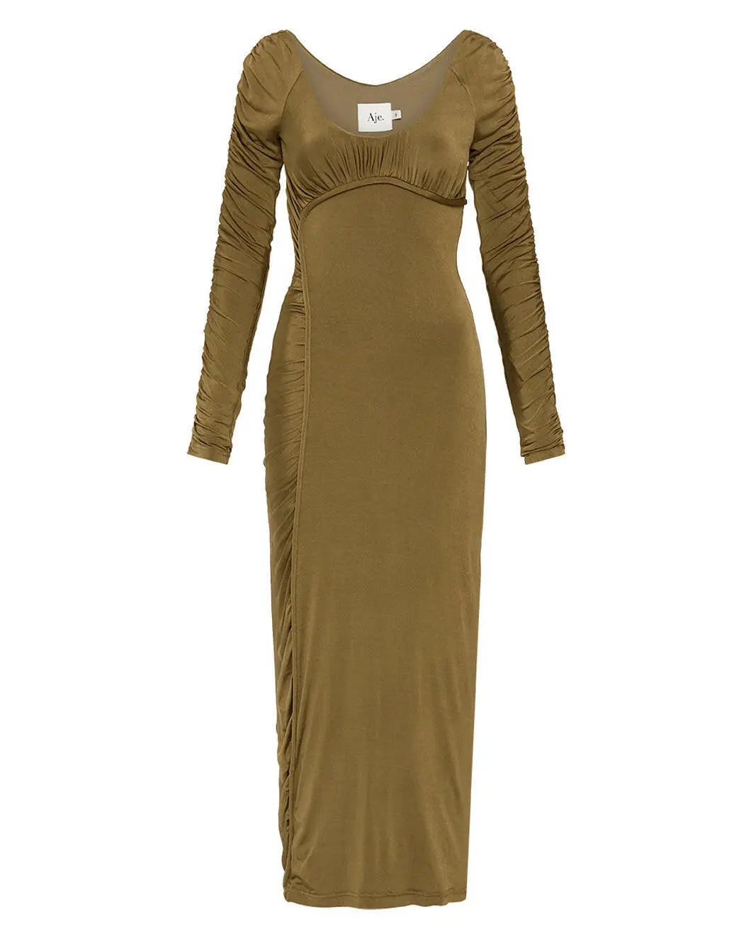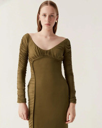 FINAL SALE The Cini Gathered Midi Dress in Khaki by Aje is a long sleeve, textured midi dress featuring ruched detail on the sleeves and bodice, scoop v-neckline, and fitted silhouette. - 95% Polyester, 5% Spandex - Model wears S - Side zip - #24AW5161