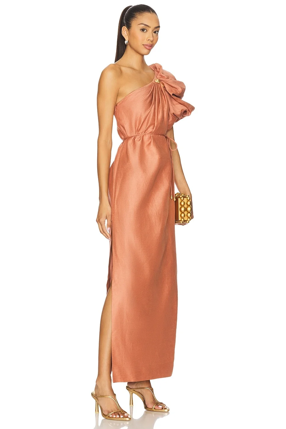- Self: 65% linen 35% viscose Lining: 100% polyester Contrast Fabric: 100% polyester - Dry clean only - Fully lined - Hidden side zip closure with self-tie belted detail - One shoulder with puffed sleeve styling - Gold-tone detail at shoulder - Midweight linen fabric - Revolve Style No. AJER-WD63 - Manufacturer Style No. 25SU5363