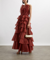 DETAILS Gown Maxi length Rouleau cord neckline with hardware V-neck cut-out Structured bodice with internal boning Elasticated side panels Ruffle-tiered skirt External metal back zip Fully lined SIZE & FIT Model is 178.5cm/5'10" ; Chest: 77.5cm; Waist: 58.5cm; Hips: 86cm and wears a size 8 COMPOSITION & CARE 100% Polyester Dry clean