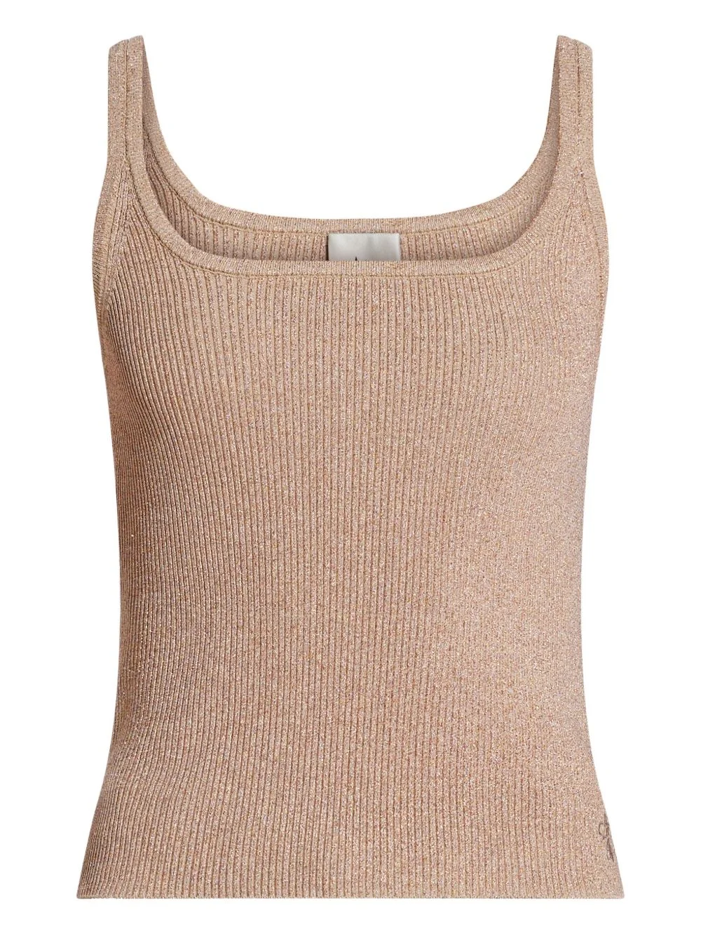 embroidered-logo tank top Highlights - Pink - Embroidered logo - Ribbed knit - Square neck - Sleeveless Imported Composition Viscose 38%, Metallised Fibres 31%, Nylon 21%, Elastane 10% Washing instructions Read Manufacturer Guidelines