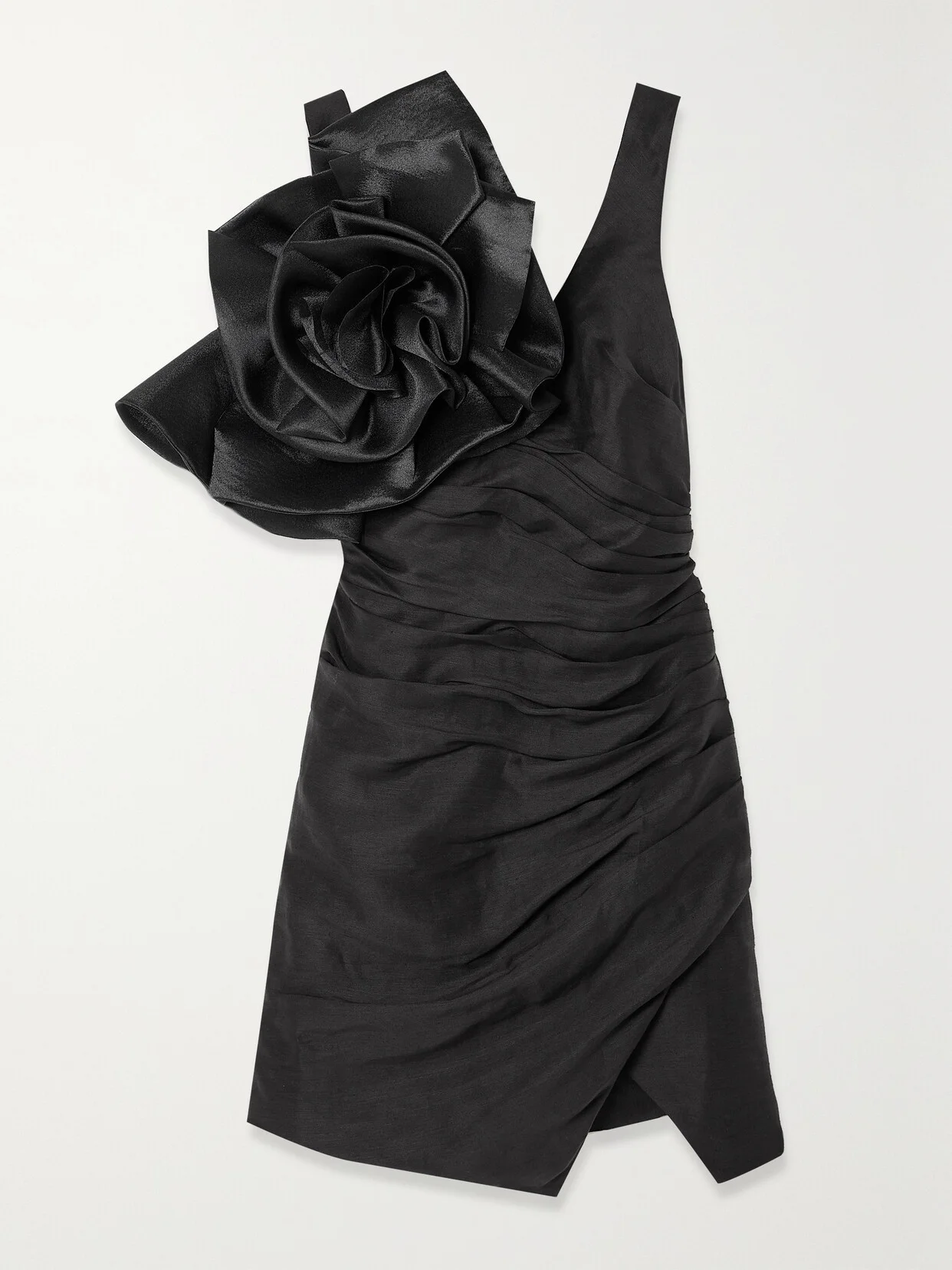 Aje's Resort '24 collection celebrates 15 years of the brand by re-imagining some of its signature styles. Cut from linen-blend, this 'Energy' mini dress is ruched and shirred for a close fit and appliqued with an oversized satin rose.