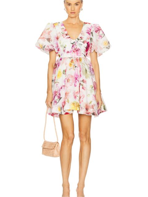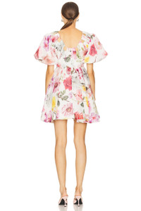 - Self: 50% lyocell 38% linen 12% nylon Lining: 100% cotton Contrast Fabric: 100% polyester - Dry clean only - Fully lined - Hidden back zip closure - Puffed sleeve styling with elastic cuffs - Floral design throughout - Midweight voile fabric - Revolve Style No. AJER-WD59 - Manufacturer Style No. 25SU5469