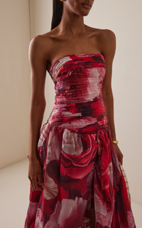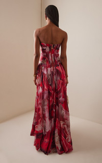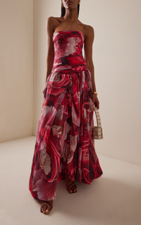 Aje designs are the epitome of effortless style, with elevated everyday essentials and statement occasion pieces for the modern woman. Founded in 2008 by best friends Adrian Norris and Edwina Forest, the Australian fashion house is dedicated to raw beauty, tough femininity, and effortless cool. Aje designs speak to the modern woman who is confident, inspiring, and unconventional in her style, as she effortlessly navigates her way between her urban and coastal lives. Channelling effortless romance, this ‘Flora’ gown is constructed from lightweight voile shaped to a ruched corset with internal boning and a gathered skirt that floats naturally to the ground. Style with a cute clutch and heeled sandals. PRODUCT DETAILS - Pre-Fall ‘25 - Zip fastening - Composition: 50% Tencel, 38% linen,12% nylon - Dry clean - Designer Color: Prismatic Floral Red - Imported SIZE & FIT - Our model is wearing a size AU 6 - Model is 5'10" with a 31" bust, 23.5" waist, and 33.5" hip