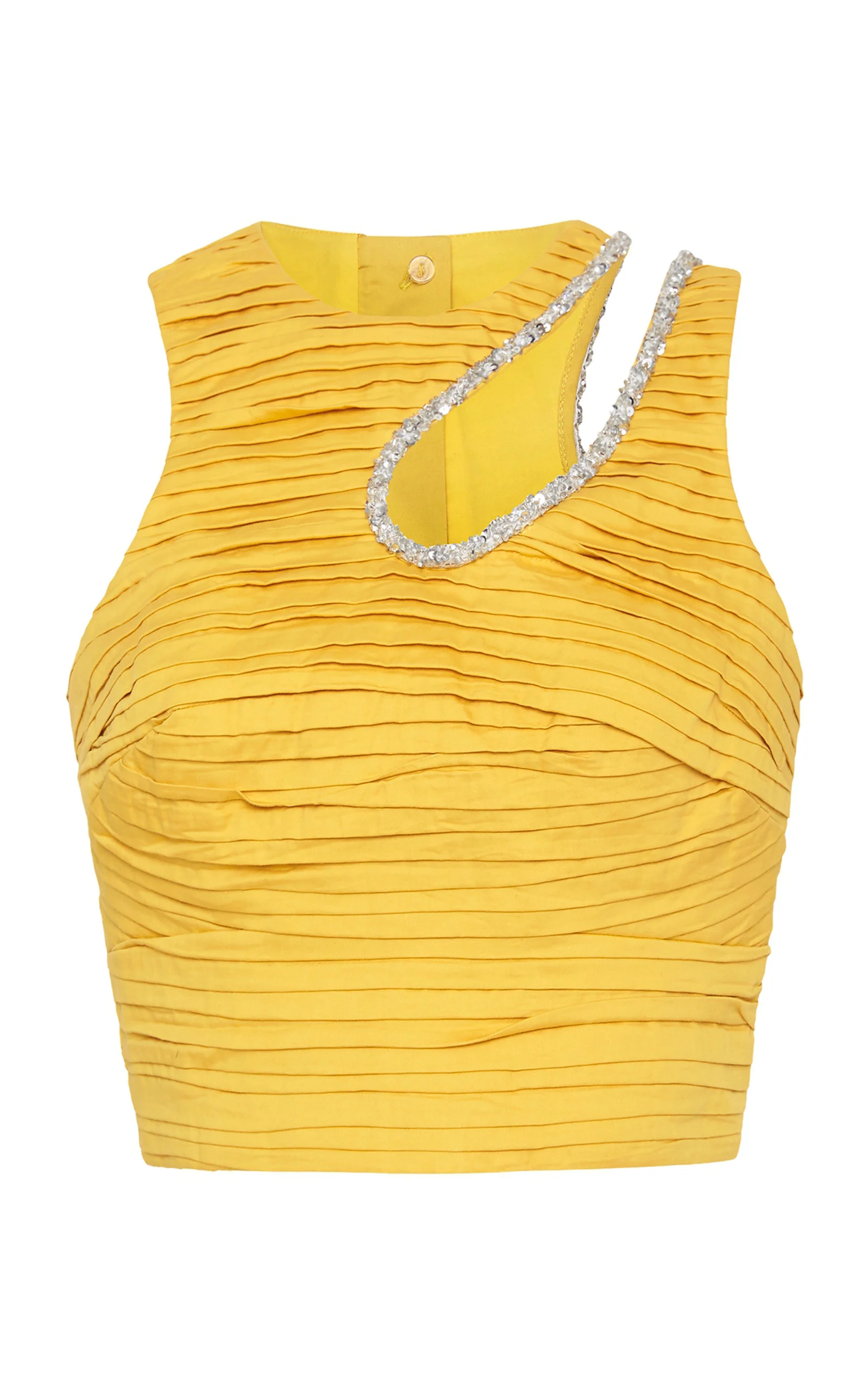This season, Australia’s Adrian Norris and Edwina Robinson flaunt their eye for details that bring a cool edge to their crisp and pure femininity. The 'Jolie' crop top has a fitted cut made from pleated cotton with a sequined teardrop-shaped cutout along the shoulder. Complete the look with the matching skirt from this season. PRODUCT DETAILS - Button fastenings through back - Composition: 100% cotton - Dry clean - Imported SIZE & FIT - Our model is 175cm/ 5'9" and wearing a size AU 6 - Fits small to size, our fit specialist recommends taking one size up - Designed for a slim fit
