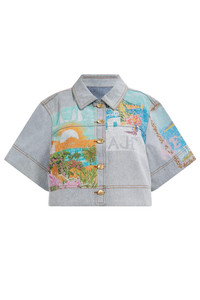 DETAILS AND INSIGHT Aje mae cropped denim shirt in postcard wash. 100% Cotton, 13.3 Oz Dry Clean Made In China Style 26RE1102-POSTCD WSH