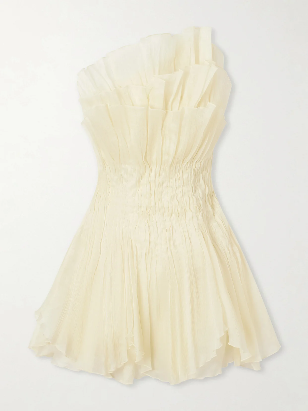 Aje's 'Nisha' dress echoes the sprouting of a flower. Made from layers of airy organza, it's shirred through the waist to highlight the floaty silhouette that falls in asymmetric lines.