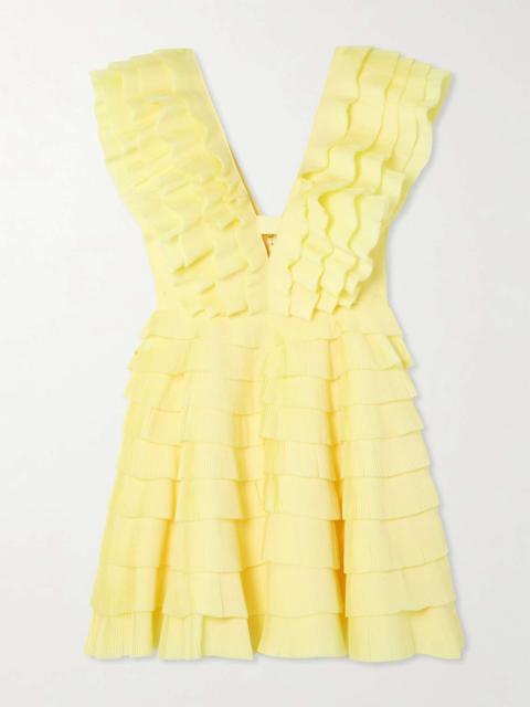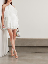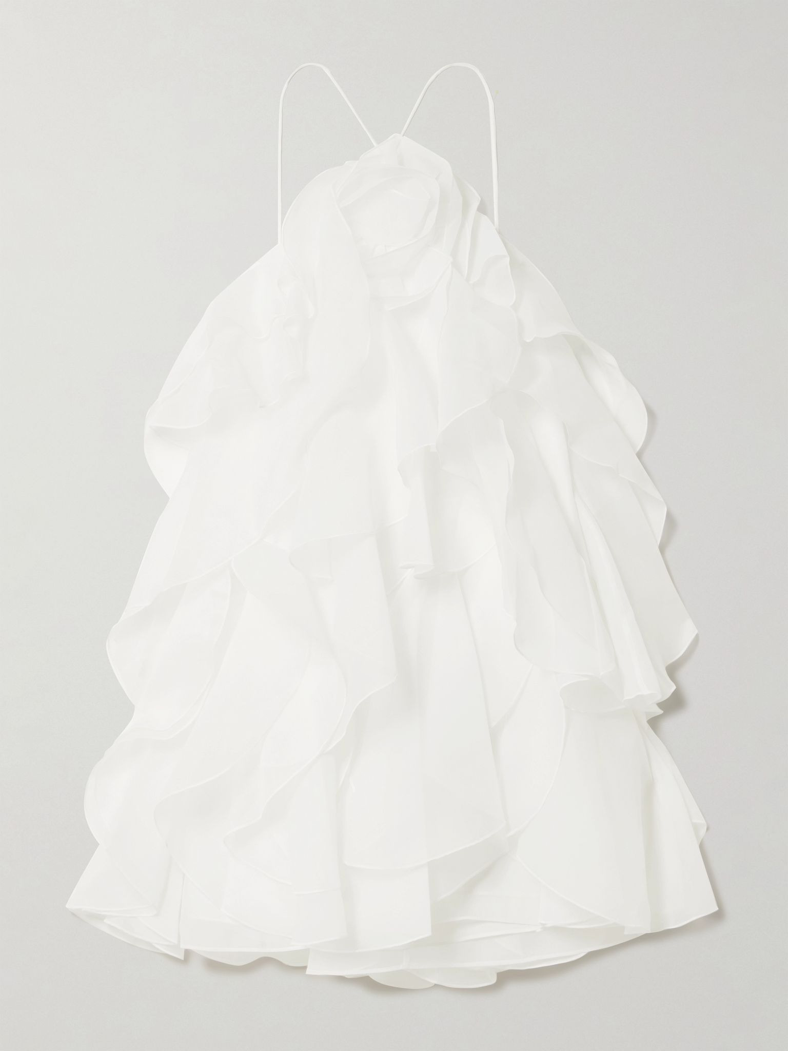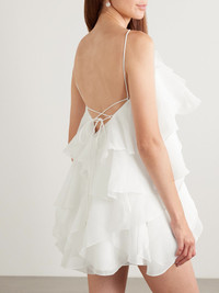Aje's 'Pandorea' mini dress is beautifully feminine, playful and romantic. Made from layers of lightweight chiffon, it has cascading ruffles throughout and a dimensional flower applique at the center. The barely there straps balance the dramatic design. Large to size. See Size & Fit notes. Size & Fit - Fits true to size, take your normal size - Intended for a relaxed fit - Fully adjustable shoulder straps - Lightweight, non-stretchy fabric - Model is 177cm/ 5'10" and is wearing a UK 8 Model measurements: - Bust: 85cm/ 33” - Waist: 66cm/ 26” - Hip: 92cm/ 36” Details & Care - Ivory chiffon - Button and ties at back - 100% polyester; trim: 100% cotton; lining: 100% polyester - Fully lined - Dry clean