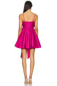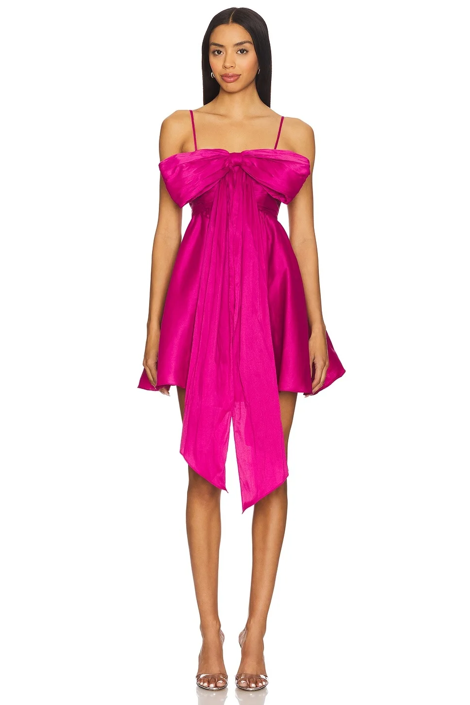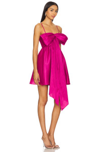 - Self: 100% polyester Lining: 100% cotton Contrast Fabric: 100% polyester - Dry clean only - Fully lined - Hidden back zipper closure and adjustable shoulder straps - Side seam pockets - Oversized tonal front bow design - Midweight high-shine poplin fabric with ruching - Revolve Style No. AJER-WD56 - Manufacturer Style No. 25SU5172