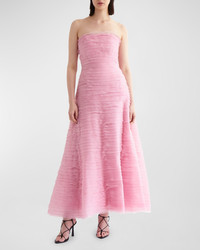 Aje "Soundscape" dress features horizontal organza frills throughout and a voluminous skirt Approx. 50"L from shoulder to hem Strapless neckline Sleeveless Fitted bodice with boning Full length Fit and flare silhouette Invisible back zip, hook and eye closure Polyester Lining: Cotton Dry clean Imported
