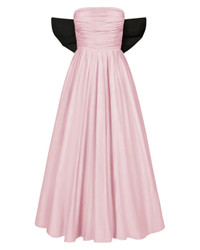 The Thea Gown in Pink Tink/Black by Aje is a strapless maxi dress with a fitted, ruched bodice and full volume shirt. This dress features a straight neckline, side seam pockets, and a large bow detail on the back. Perfect for a black tie wedding or gala event. - Material: 1 00% Polyester - Details: Lined style. External side zip with sculptural puller. - Fit: The model wears a size AU 8/S Height: 178cm/ 5’10 Bust: 76cm Waist: 65cm Hips: 90cm - Style it with: A pointed toe pump and black clutch. - Dry Clean Only - 25SS5432