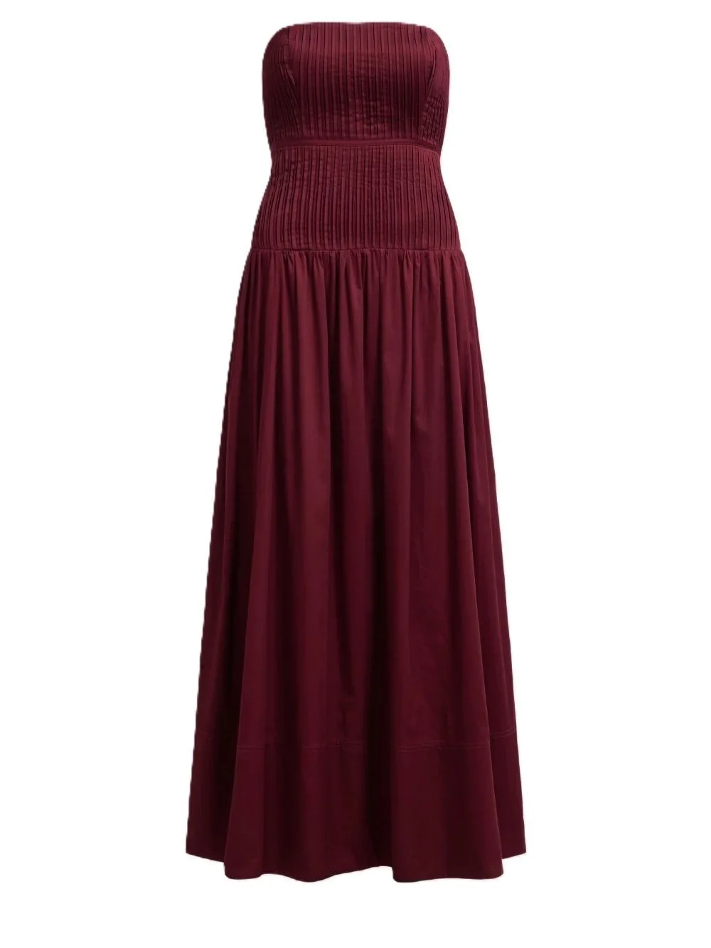 Strapless gown Straight neckline Structured bodice with internal boning Fine vertical ruching throughout bodice Defining waist seam Full skirt with tucks and gathers External metal zip with sculptural puller Lined style 100% Cotton UK size Model code: 26RE5185 Variant code: PLM