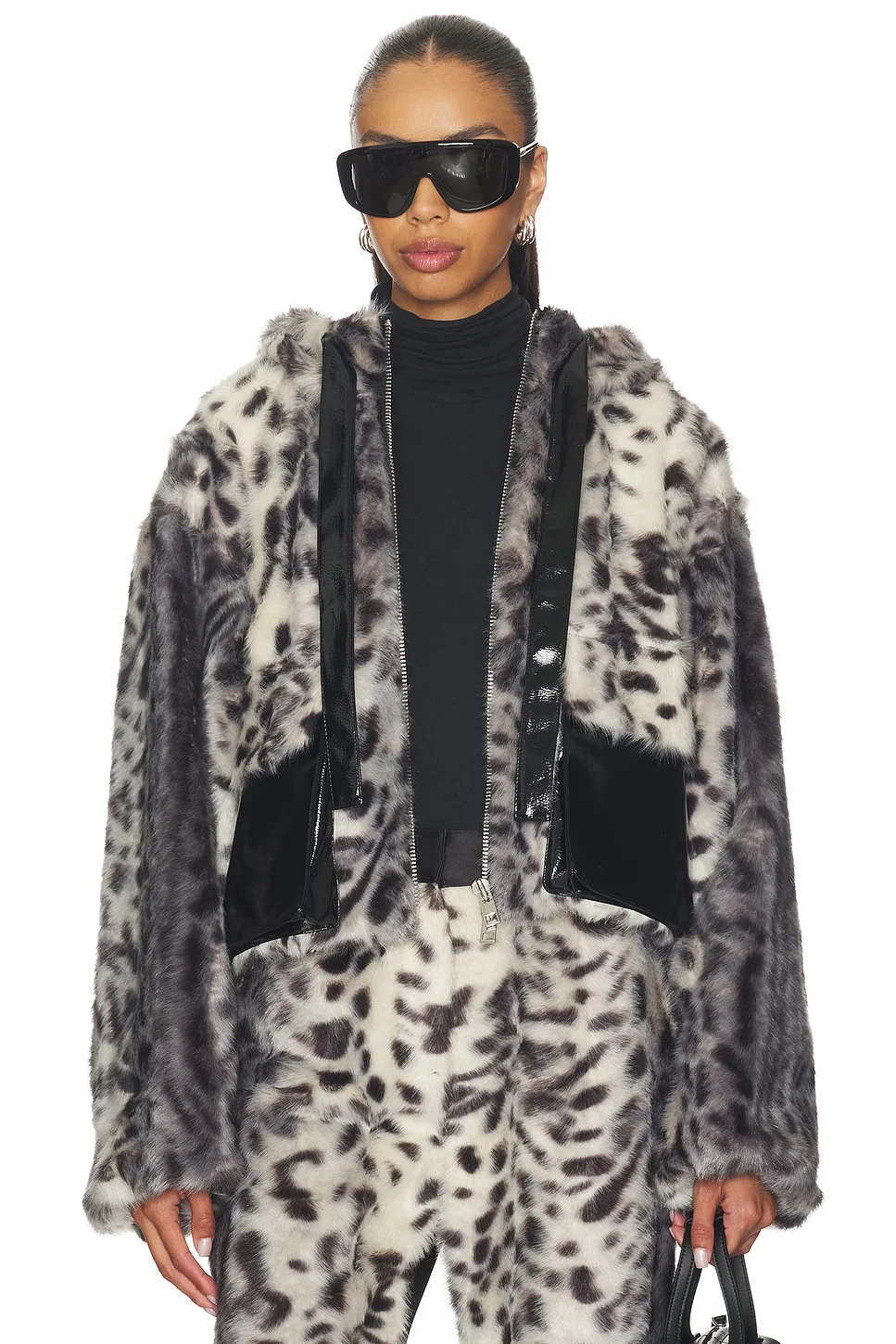 - Self: 78% modacrylic 22% polyester Lining: 100% polyester Contrast fabric: 100% polyester - Made in China - Dry clean - Front zip closure with drawstring hood and elasticized waist - Front patch pockets - Faux fur fabric with contrast faux leather panels - Item not sold as a set - Revolve Style No. AKNR-WO18 - Manufacturer Style No. R26-8005-LEP