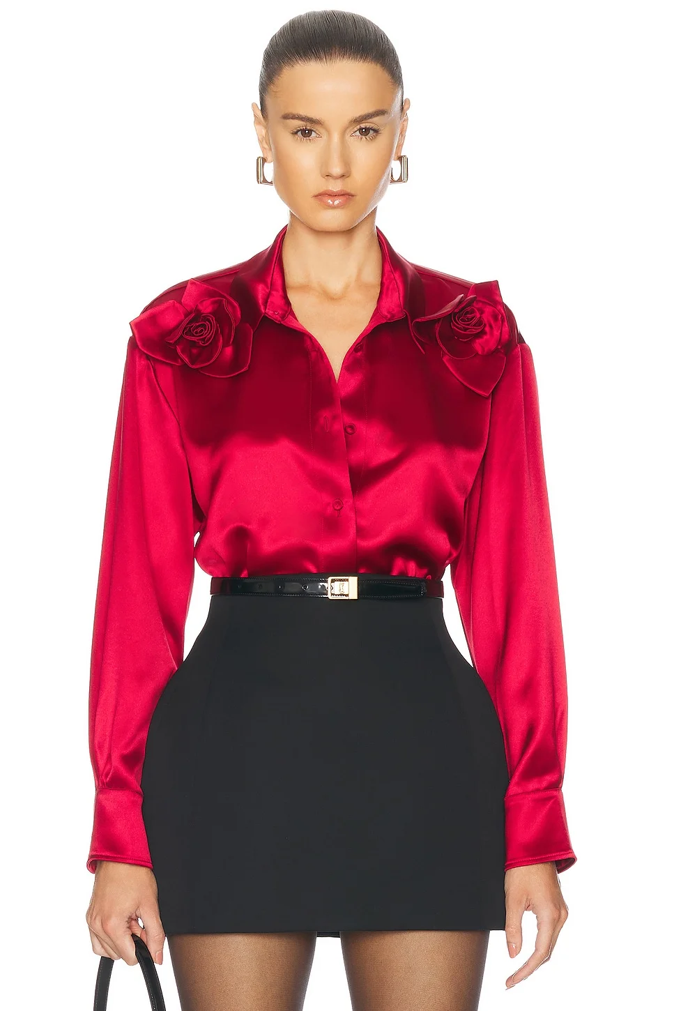 Details - 77% acetate, 23% polyester - Made in China - Dry clean only - Front button closure - 3D floral accent at shoulders - Buttoned cuffs - Satin fabric - Our Style No. AKNF-WS38 - Manufacturer Style No. R25-5034-POP