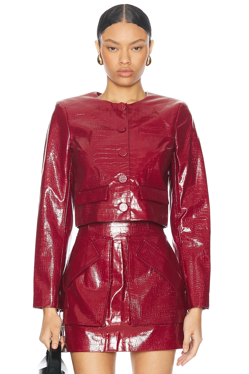 Details - Self: 50% rayon, 50% polyurethane - Lining: 100% polyester - Made in China - Dry clean only - Front button closure - Padding at shoulders - Front flap pockets - Croc faux leather fabric - Item not sold as a set - Our Style No. AKNF-WO16 - Manufacturer Style No. F24-8019-BUR