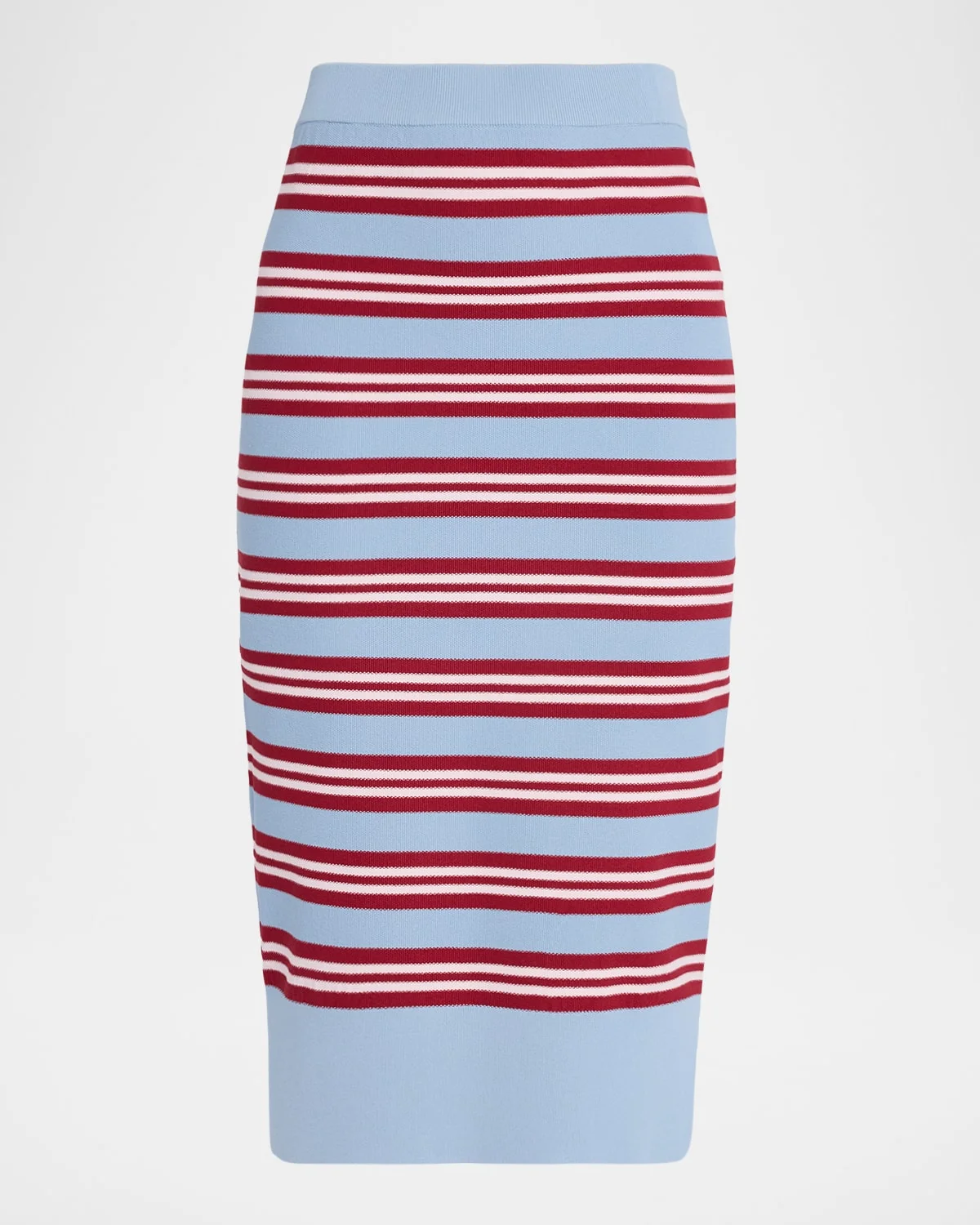 AKNVAS "Rosalyn" vibrant striped pencil skirt in a comfortable stretch knit High rise Elastic waistband Pencil style Hem hits around the knee Pullon style Viscose/polyester Imported