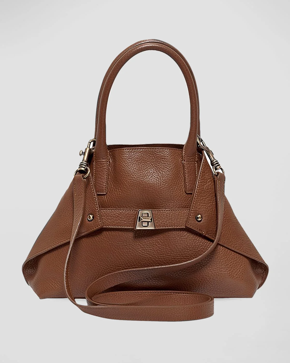 - Pebbled leather with bronze-colored hardware. - Rolled tote handles; 4" drop. - Removable crossbody strap; 22" drop. - Open top with center snap. - Folded sides join into belt with turn-lock closure at center front. - Trapezoidal shape, a signature element of the Akris collection. - Interior, fabric lining; one zip and two open pockets. - 6"H x 9 1/2"W x 3"D; weighs approx. 1lb. - "Ai" is imported of Italian material.