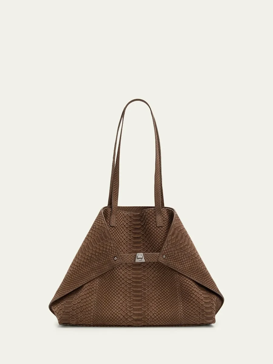 Akris "Ai" shoulder bag in genuine python and suede 3 convertible looks: rectangular shopper, pure trapezoid tote or signature tote Flat shoulder straps Open top Folded sides join into belt with turnlock closure at center front Interior, one zip pocket and leashed zip pouch bag Approx. 18"H x 12"W x 5"D Spot clean Made in Romania