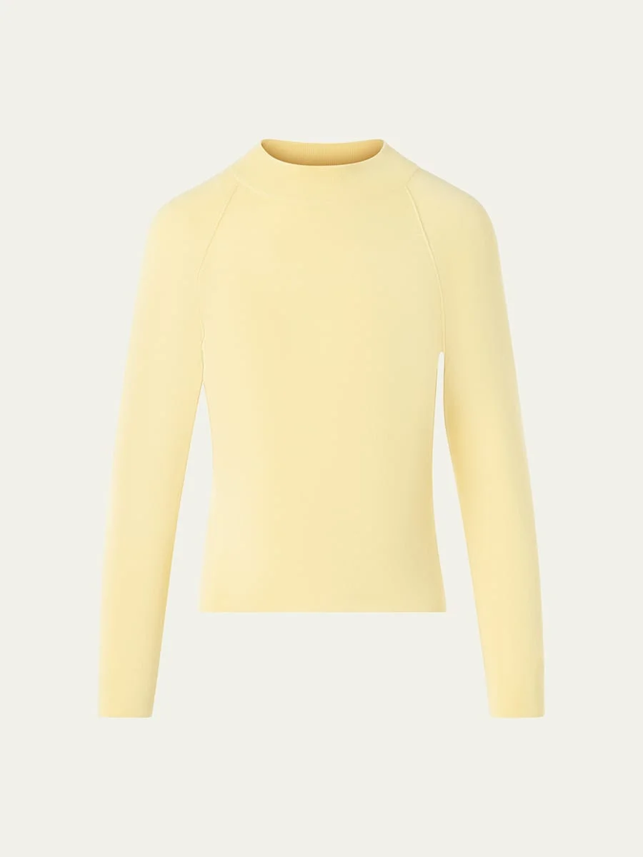 Akris sweater knit in a cashmeresilk rib Funnel neckline Long raglan bracelet sleeves Slim fit Pullover style Cashmere/silk Dry clean Made in Romania
