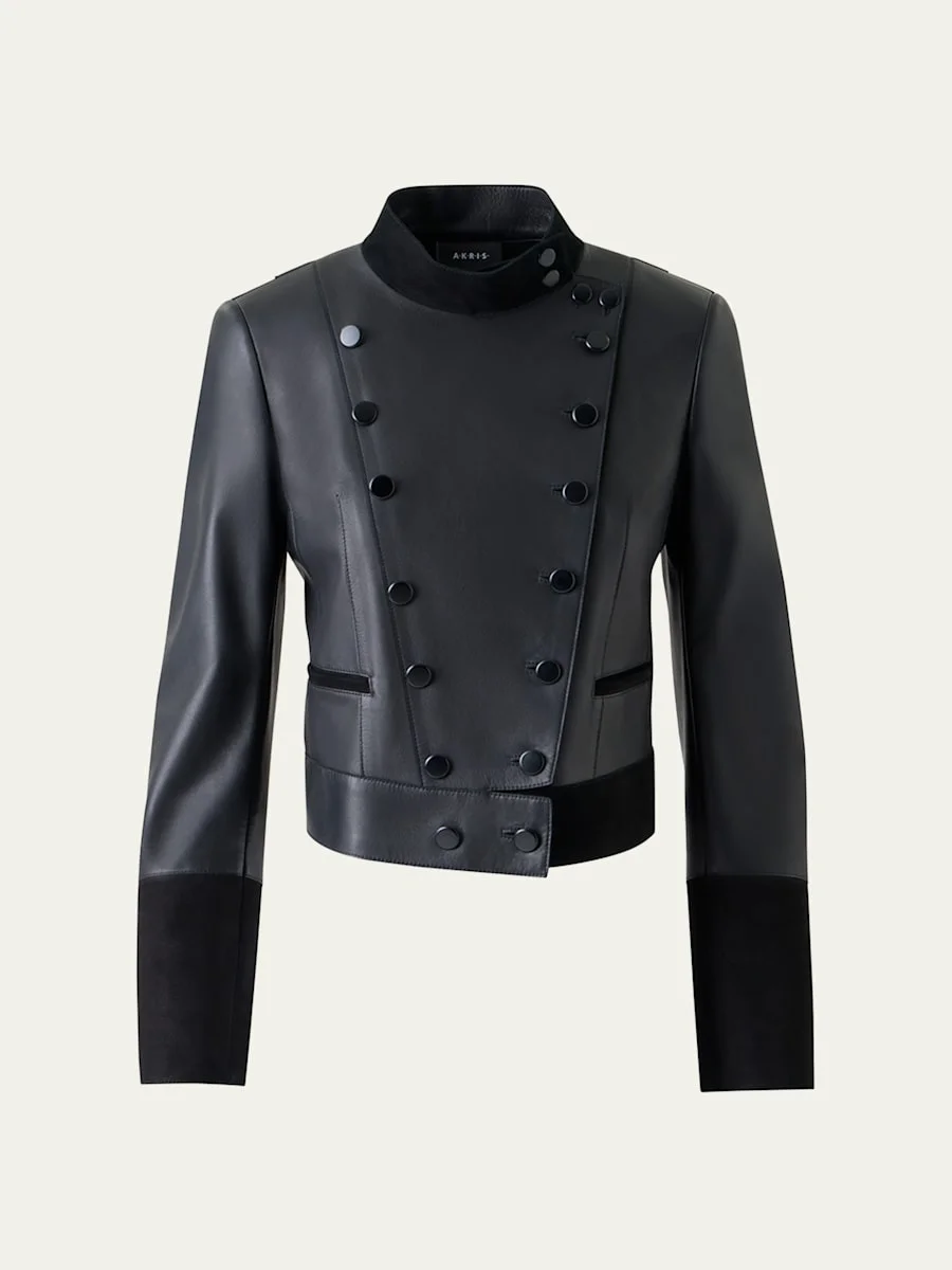 Akris "Dean" jacket crafted from nappa lambskin leather with supple suede trim Stand collar; double-breasted front Long sleeves; zip cuffs Hip welt pockets Fitted Hip length Leather Lining: Silk Dry clean Made in Switzerland Online Inquiries: BGS21_BA281| Store Inquiries: #5019859