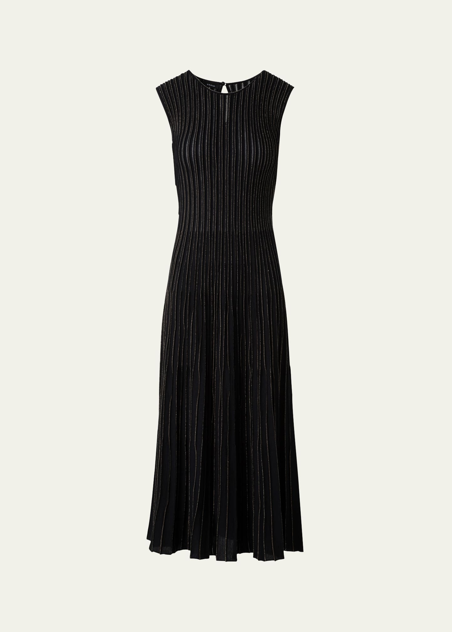 Akris dress in metallic pinstripe pleated knit creating a flared skirt Round neckline; button/keyhole back Sleeveless Hem falls below the knee A-line silhouette Slipover style Virgin wool/silk/cotton/Lurex® metallic fiber Dry clean Made in Romania Model is 5'10"/177cm. Online Inquiries: BGS21_B9F55| Store Inquiries: #4859243