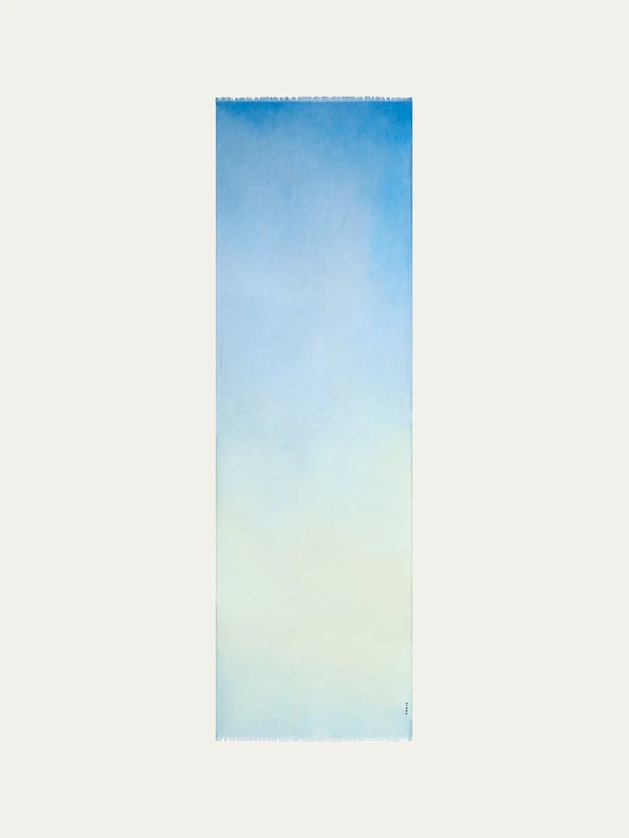 Akris scarf knit in a soft cashmere with a sunbeam ombre print Approx. 78.7"L x 25.6"W Eyelash fringed ends May be styled multiple ways Cashmere Dry clean Made in Romania