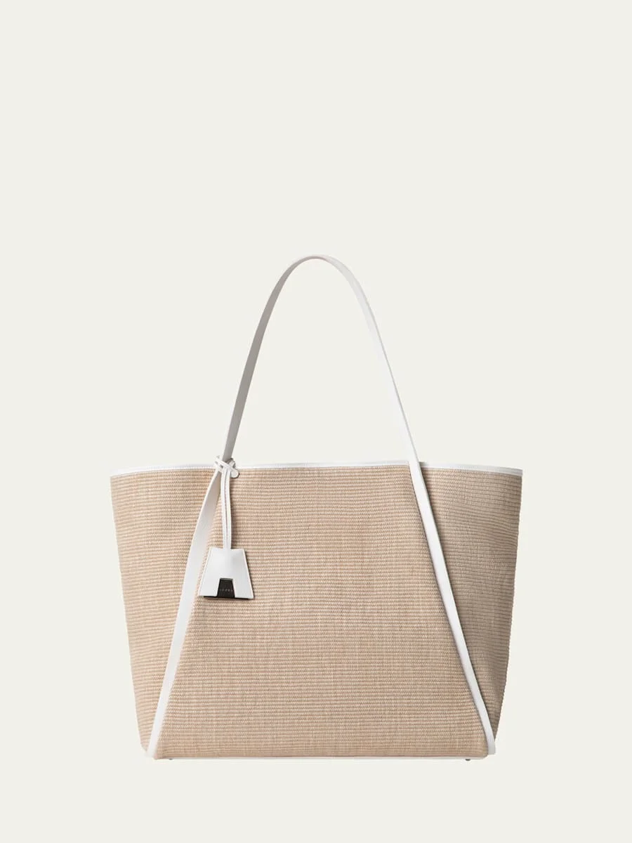 Akris "Alex" tote bag in raffia-like cotton and leather Shoulder straps with keyring tag Open top with magnetic closure Interior, one slip pocket Approx. 13.9"H x 20.4"W x 10.2"D Made in Romania Online Inquiries: BGS21_V6CEZ| Store Inquiries: #4886299