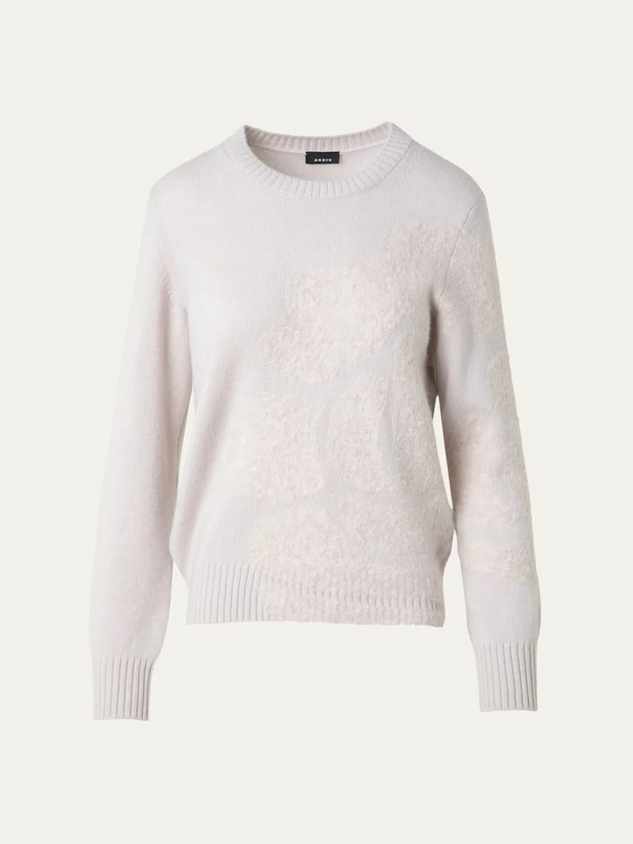 Akris 12gg cashmere-silk knit sweater featuring a tonal 3D boucle anemone intarsia Crew neckline Long sleeves Relaxed fit Ribbed cuffs and hem Pullover style Cashmere/silk Dry clean Made in Romania Online Inquiries: BGS21_B9UDW| Store Inquiries: #4970725