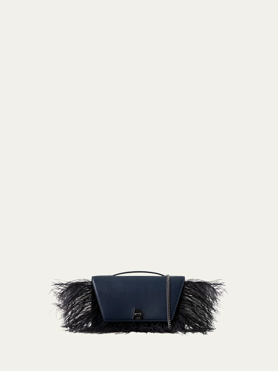 Akris "Anouk" tophand bag in smooth leather with ostrich feather trim Flat top handle Detachable chain shoulder strap Flap top with turnlock closure Approx. 2.6"H x 9.8"W x 5.9"D Spot clean Polyester/leather Made in Romania