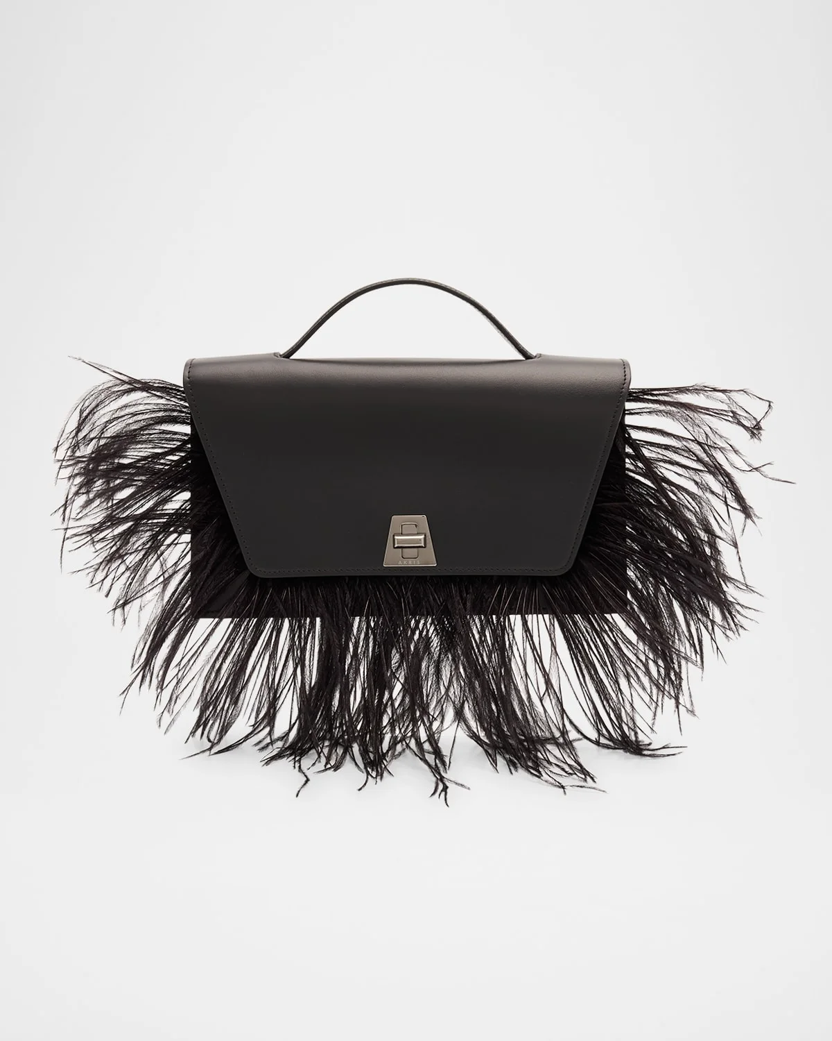 - Akris "Anouk" top-hand bag in smooth leather with ostrich feather trim - Flat top handle - Detachable chain shoulder strap - Flap top with turn-lock closure - Approx. 2.6"H x 9.8"W x 5.9"D - Spot clean - Polyester/leather - Made in Romania