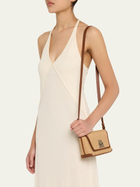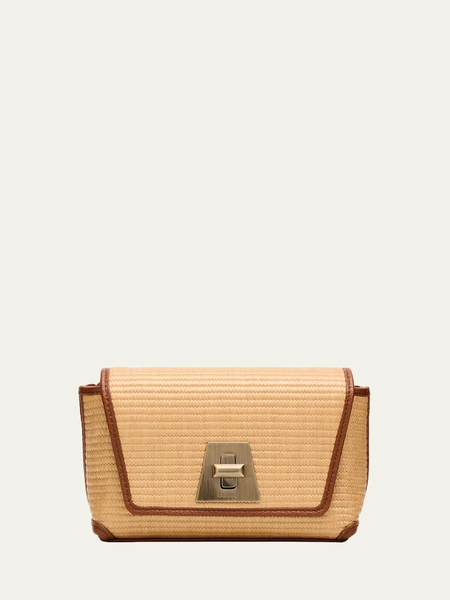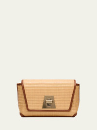 Akris "Anouk" two-tone woven raffia and calf leather crossbody bag. Adjustable shoulder strap. Flap top with turn-lock closure. Exterior, slip pocket under flap. Interior, zip pocket. 3.2"H x 7"W x 4.5"D. Made in Romania. Online Inquiries: BGS21_V5DDA| Store Inquiries: #4263837