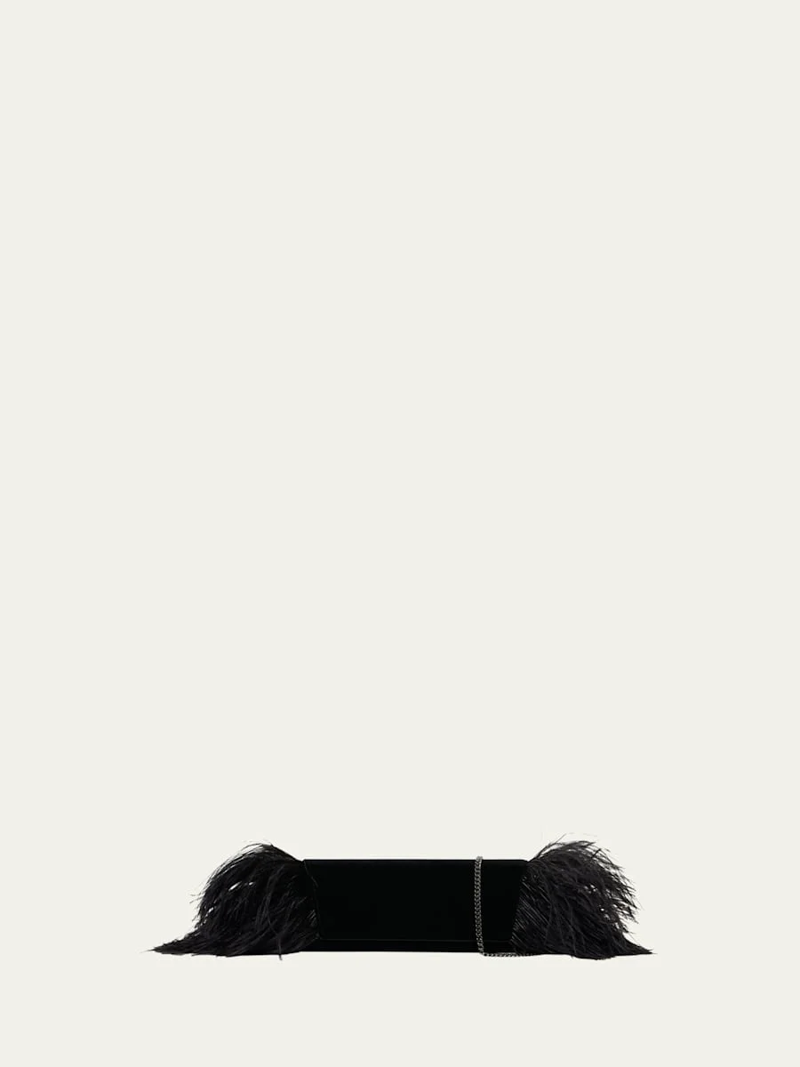 Akris "Anouk" trapezoid clutch bag with tonal ostrich feather trim Detachable chain shoulder strap Can be worn as a clutch or shoulder bag Envelope flap top with magnetic closure Center zip compartment divides interior Approx. 4.5"H x 11.6"W x 2.1"D Polyester/leather Spot clean Made in Romania Online Inquiries: BGS21_V6L0C| Store Inquiries: #5035759